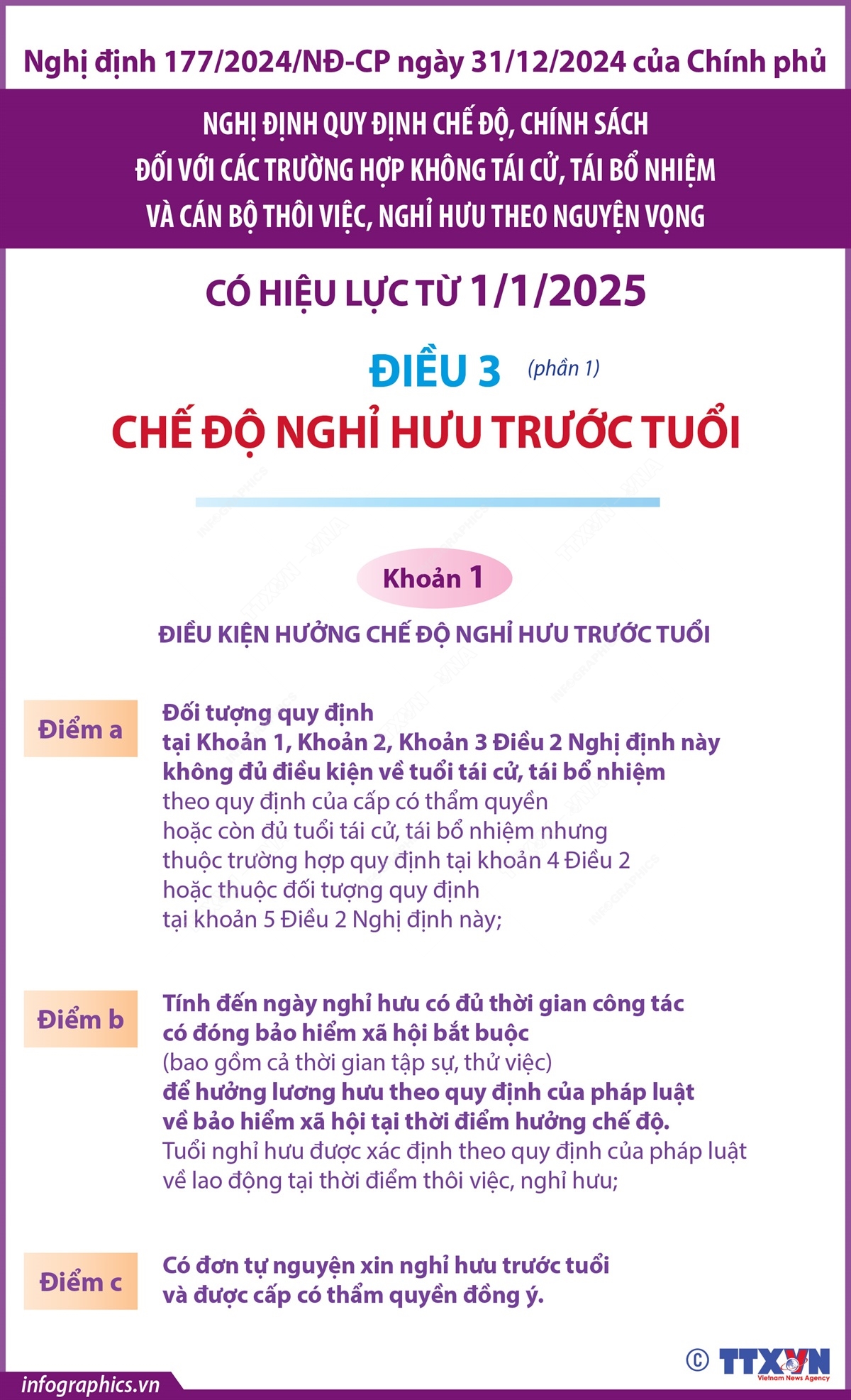 Điều 2 Nghị định số 177/2024/NĐ-CP ngày 31/12/2024 của Chính phủ có hiệu lực thi hành từ 1/1/2025 quy định cụ thể chế độ nghỉ hưu trước tuổi đối với các trường hợp không tái cử, tái bổ nhiệm và cán bộ thôi việc, nghỉ hưu theo nguyện vọng như sau.
