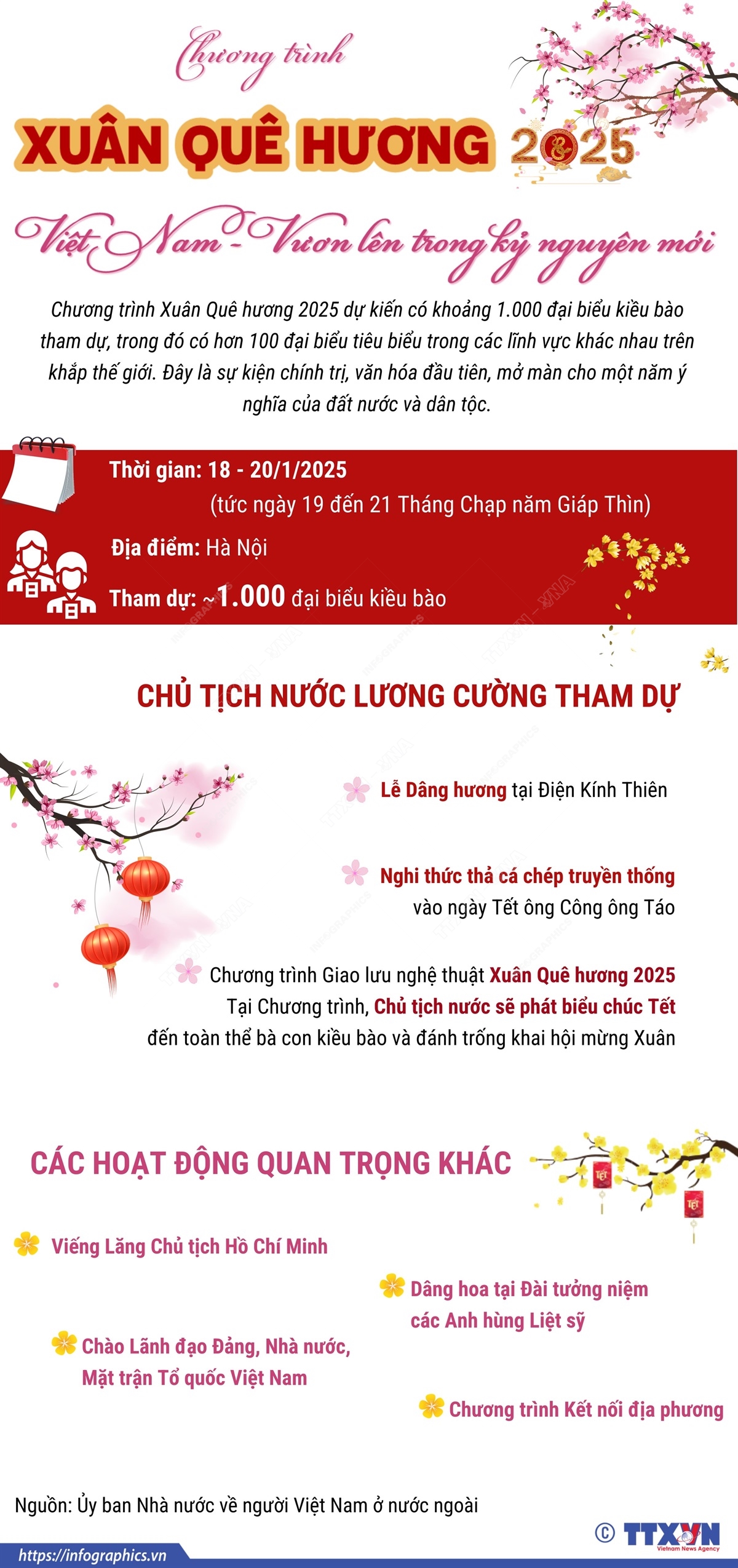 Hằng năm vào dịp Tết cổ truyền của dân tộc, Ủy ban Nhà nước về người Việt Nam ở nước ngoài (Bộ Ngoại giao) phối hợp với các cơ quan liên quan tổ chức chương trình “Xuân Quê hương” chào đón đồng bào xa Tổ quốc về nước vui Tết cổ truyền dân tộc. Chương trình Xuân Quê hương 2025 diễn ra từ ngày 18/1 đến ngày 20/1/2025 (tức ngày 19 đến ngày 21 Tháng Chạp năm Giáp Thìn) với nhiều nội dung phong phú. Chương trình vinh danh sự cống hiến, đóng góp lớn lao của người Việt Nam ở nước ngoài trong công cuộc xây dựng và phát triển đất nước, đồng thời, cổ vũ, động viên kiều bào phấn đấu, lao động, học tập, đoàn kết xây dựng cộng đồng ổn định, vững mạnh, cùng đồng bào trong nước đóng góp vào kỷ nguyên vươn mình của dân tộc.