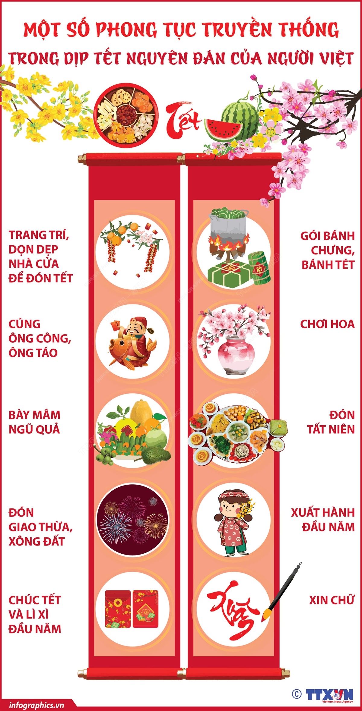 Trải qua chiều dài lịch sử, các phong tục tập quán của người Việt trong dịp Tết cổ truyền vẫn được lưu giữ từ đời này qua đời khác. Đó là các phong tục như: Trang trí, dọn dẹp nhà cửa để đón Tết; Gói bánh chưng, bánh tét; Cúng ông công, ông táo; Đón Tất niên; Đón Giao thừa…