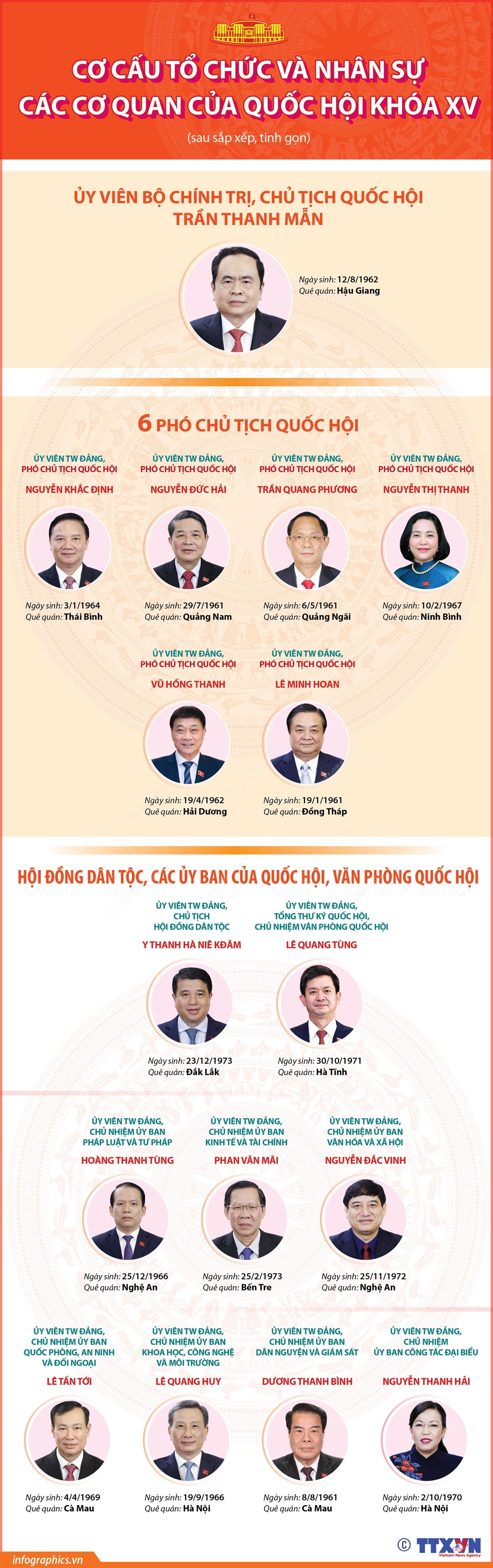 Sau sắp xếp, tinh gọn, Quốc hội có Chủ tịch Quốc hội, 6 Phó Chủ tịch Quốc hội, Hội đồng dân tộc, 7 Ủy ban của Quốc hội (Ủy ban Pháp luật và Tư pháp; Ủy ban Kinh tế và Tài chính; Ủy ban Văn hóa và Xã hội; Ủy ban Quốc phòng, An ninh và Đối ngoại; Ủy ban Khoa học, Công nghệ và Môi trường; Ủy ban Dân nguyện và Giám sát; Ủy ban Công tác đại biểu) và Văn phòng Quốc hội.
