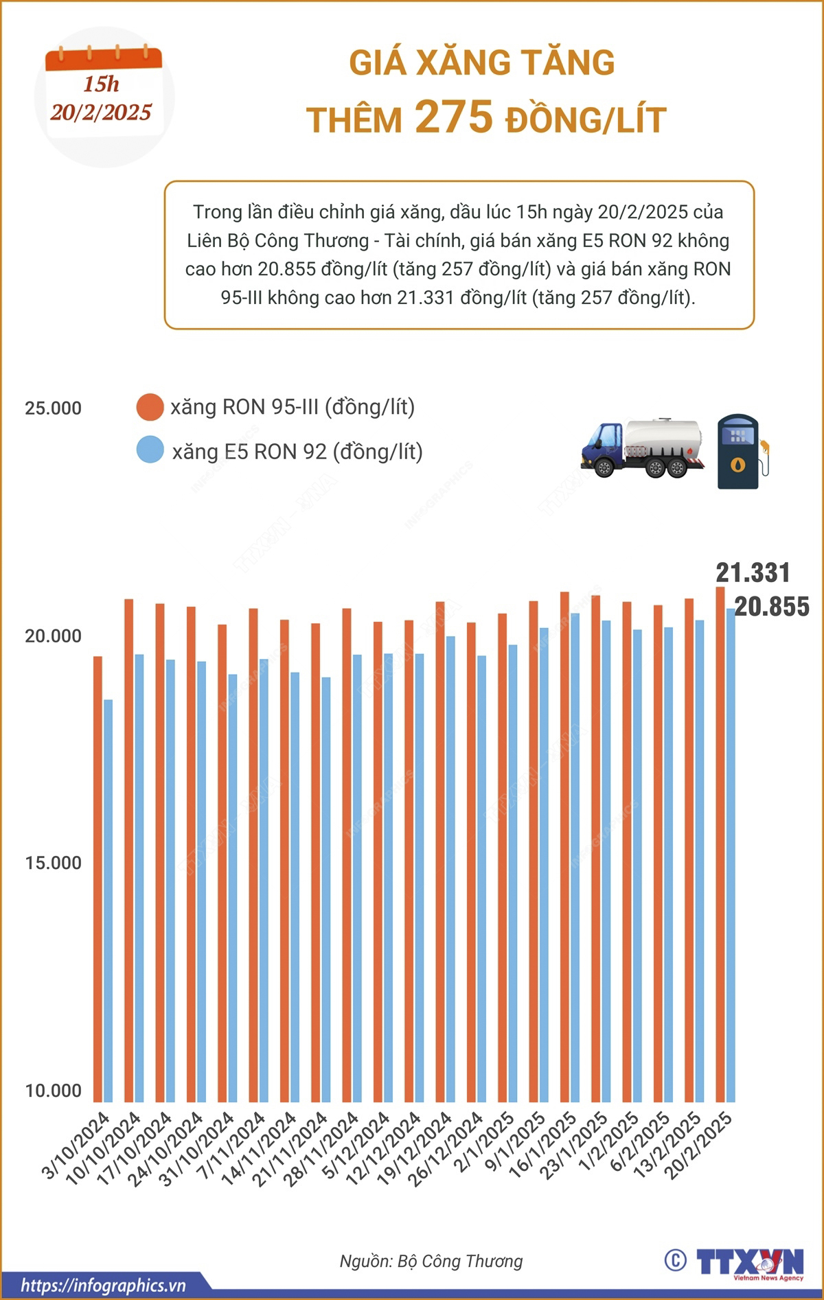 Trong lần điều chỉnh giá xăng, dầu lúc 15h ngày 20/2/2025 của Liên Bộ Công Thương - Tài chính, giá bán xăng E5 RON 92 không cao hơn 20.855 đồng/lít (tăng 257 đồng/lít) và giá bán xăng RON 95-III không cao hơn 21.331 đồng/lít (tăng 257 đồng/lít). Tại lần điều chỉnh giá gần đây nhất (ngày 13/2), giá xăng đồng loạt tăng với giá xăng E5 RON 92 tăng 156 đồng/lít, xăng RON 95-III tăng 146 đồng/lít.