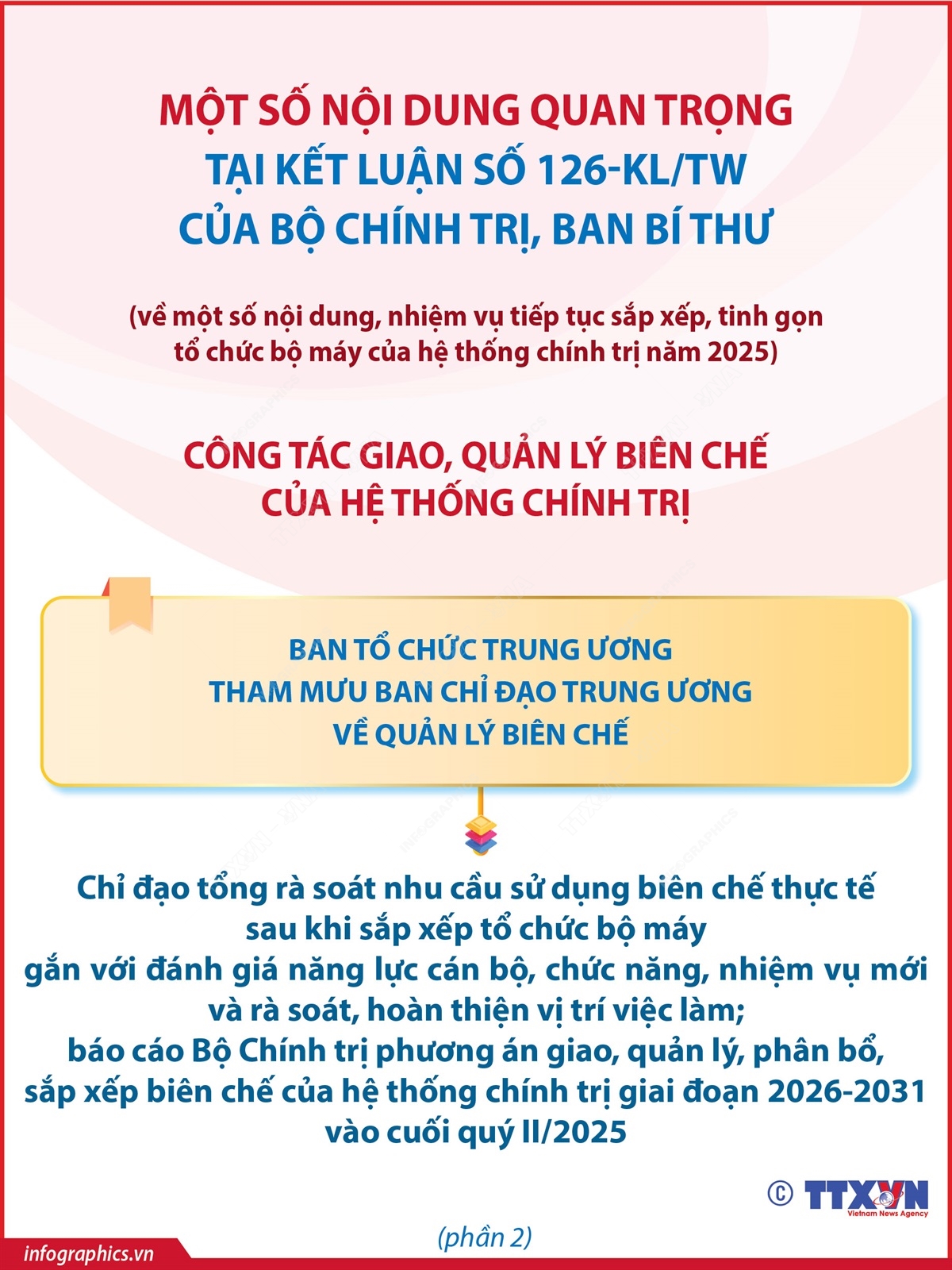 Tại Kết luận số 126-KL/TW ngày 14/2/2025, Bộ Chính trị, Ban Bí thư yêu cầu các cấp ủy, tổ chức đảng tập trung thực hiện tốt, bảo đảm đúng tiến độ một số nội dung, nhiệm vụ: Thực hiện Kết luận số 121-KL/TW của Ban Chấp hành Trung ương Đảng; công tác giao, quản lý biên chế của hệ thống chính trị; tiếp tục thực hiện sắp xếp, hoàn thiện tổ chức bộ máy của hệ thống chính trị trong năm 2025 và nhiệm kỳ 2025-2030 và hoàn thiện mô hình của hệ thống chính trị.