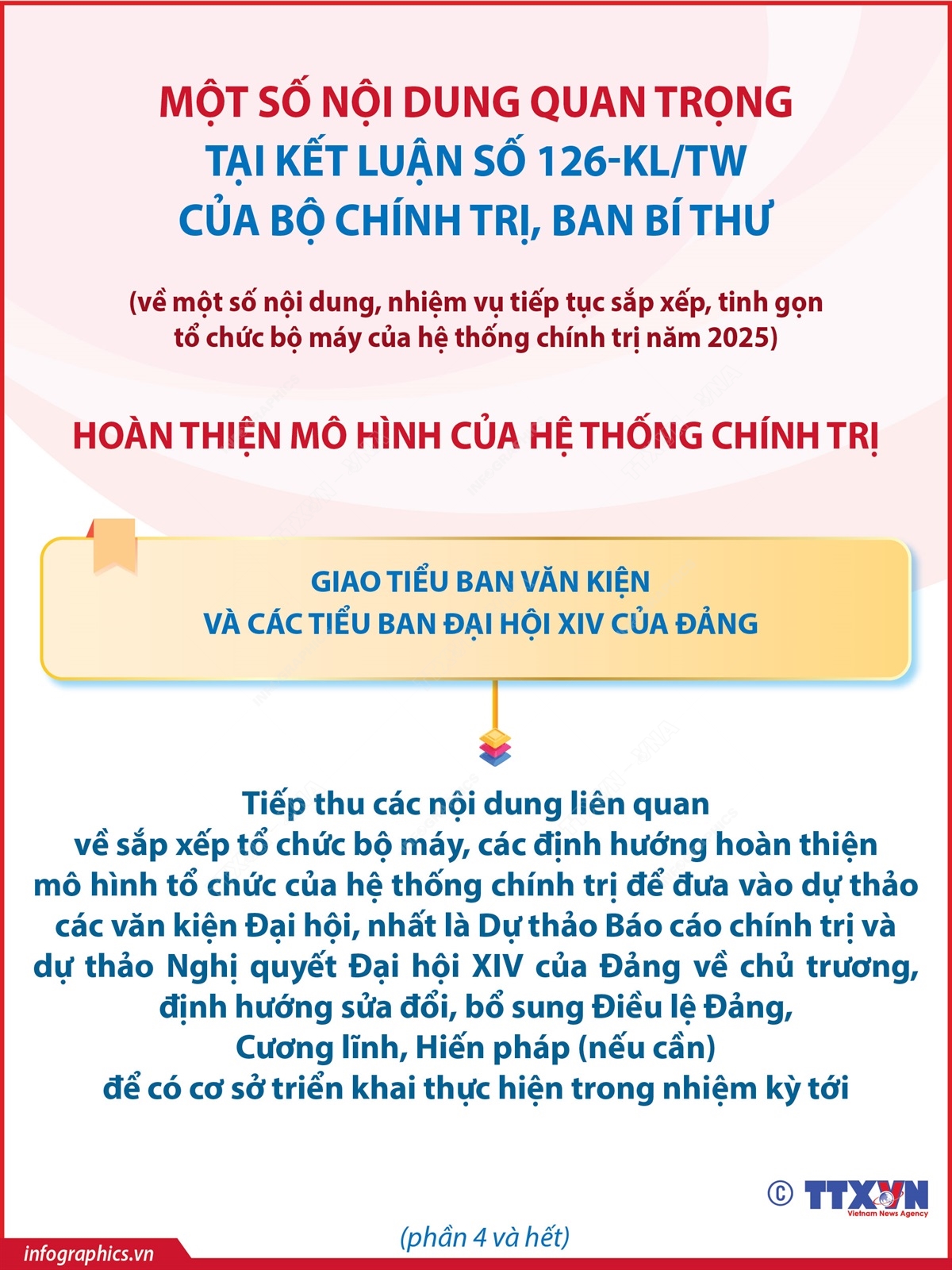 Tại Kết luận số 126-KL/TW ngày 14/2/2025, Bộ Chính trị, Ban Bí thư yêu cầu các cấp ủy, tổ chức đảng tập trung thực hiện tốt, bảo đảm đúng tiến độ một số nội dung, nhiệm vụ: Thực hiện Kết luận số 121-KL/TW của Ban Chấp hành Trung ương Đảng; công tác giao, quản lý biên chế của hệ thống chính trị; tiếp tục thực hiện sắp xếp, hoàn thiện tổ chức bộ máy của hệ thống chính trị trong năm 2025 và nhiệm kỳ 2025-2030 và hoàn thiện mô hình của hệ thống chính trị.