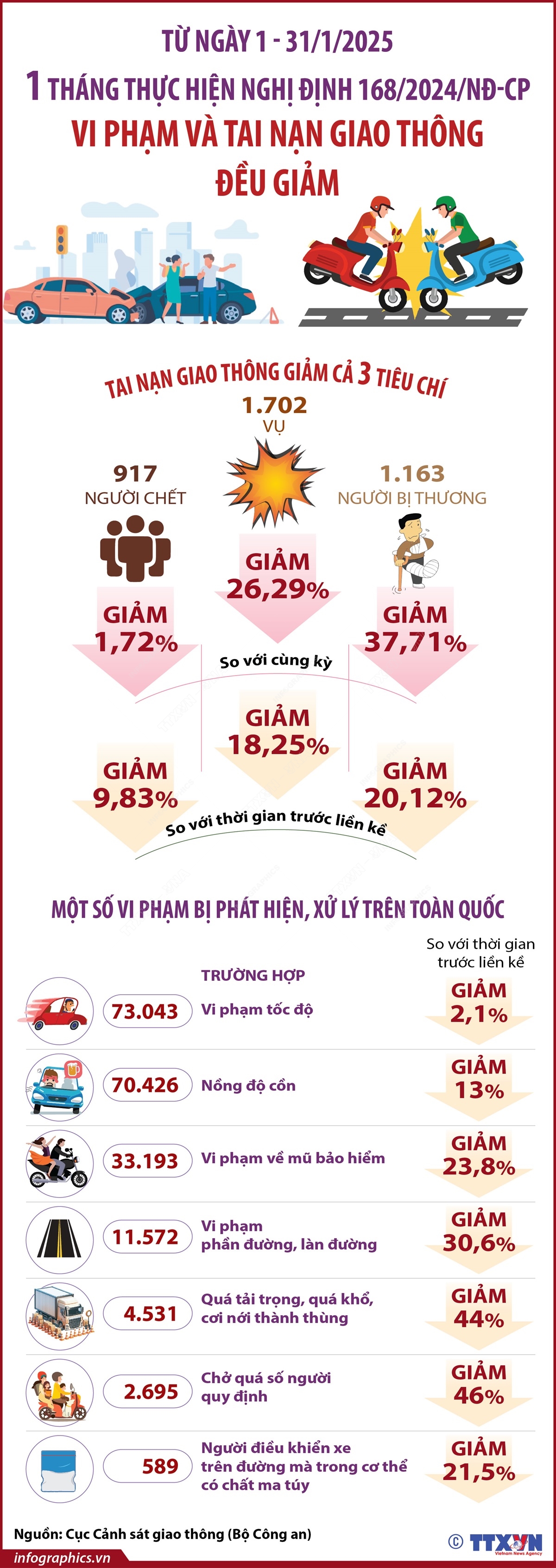 Sau một tháng thực hiện Nghị định số 168/2024/NĐ-CP của Chính phủ (quy định xử phạt vi phạm hành chính về trật tự, an toàn giao thông trong lĩnh vực giao thông đường bộ; trừ điểm, phục hồi điểm giấy phép lái xe), ý thức chấp hành pháp luật về trật tự, an toàn giao thông của người dân đã được nâng cao, tự giác chấp hành ngay cả khi không có lực lượng Cảnh sát giao thông. Tai nạn giao thông đường bộ chuyển biến rõ rệt, giảm cả 3 tiêu chí so với cùng kỳ năm trước và thời gian trước liền kề. Thông tin trên được Cục Cảnh sát giao thông cho biết sáng 6/2/2025.