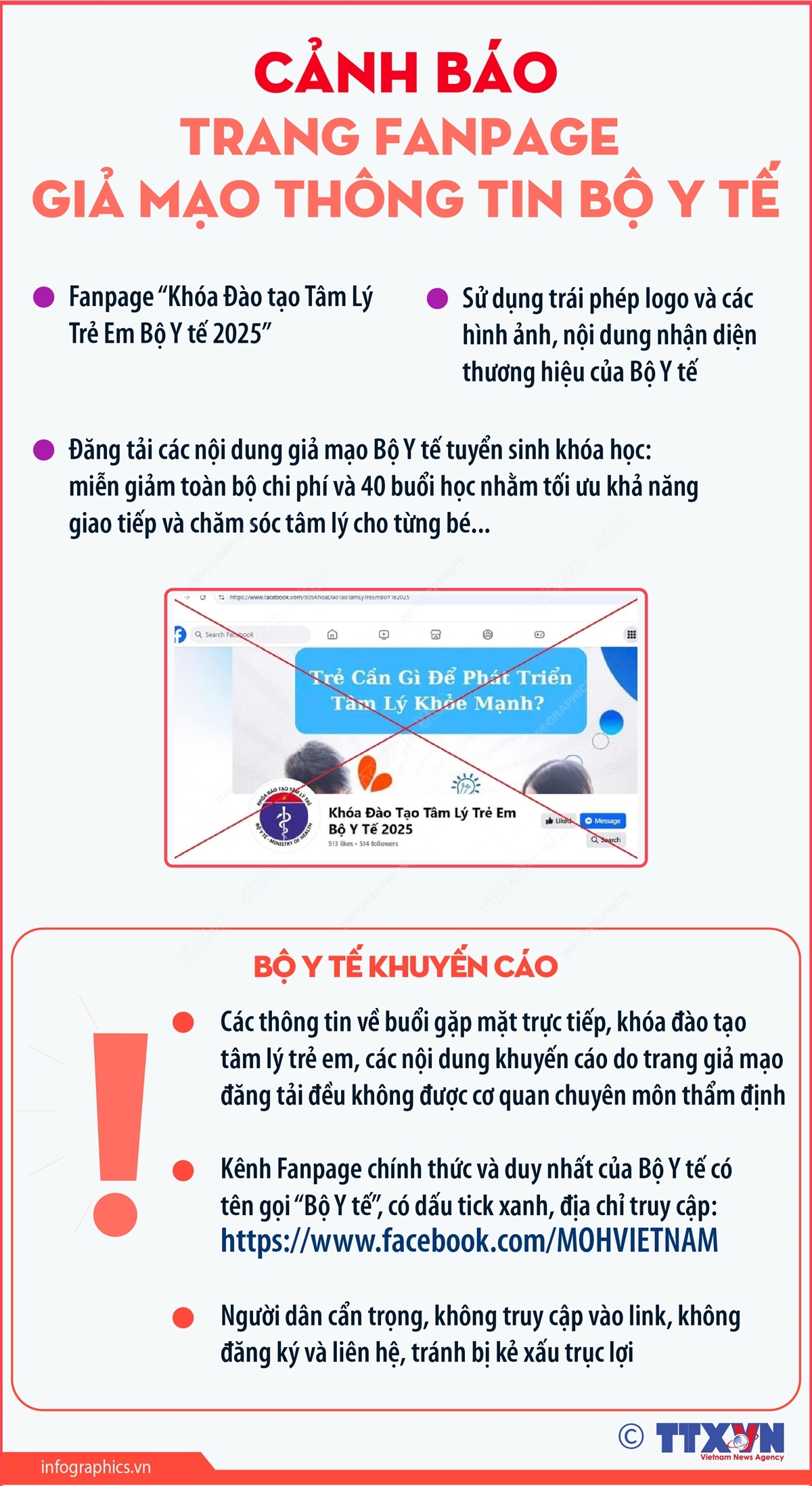 Gần đây, trên mạng xã hội Facebook xuất hiện trang Fanpage "Khóa Đào tạo Tâm Lý Trẻ Em Bộ Y tế 2025", sử dụng trái phép logo và các hình ảnh, nội dung nhận diện thương hiệu của Bộ Y tế; đăng tải các nội dung giả mạo Bộ Y tế tuyển sinh khóa học. Trang Fanpage này được quan tâm của nhiều phụ huynh nhằm giúp trẻ em có sự phát triển toàn diện. Bộ Y tế khuyến cáo người dân cẩn trọng, không truy cập vào link, không đăng ký và liên hệ, tránh bị kẻ xấu trục lợi.