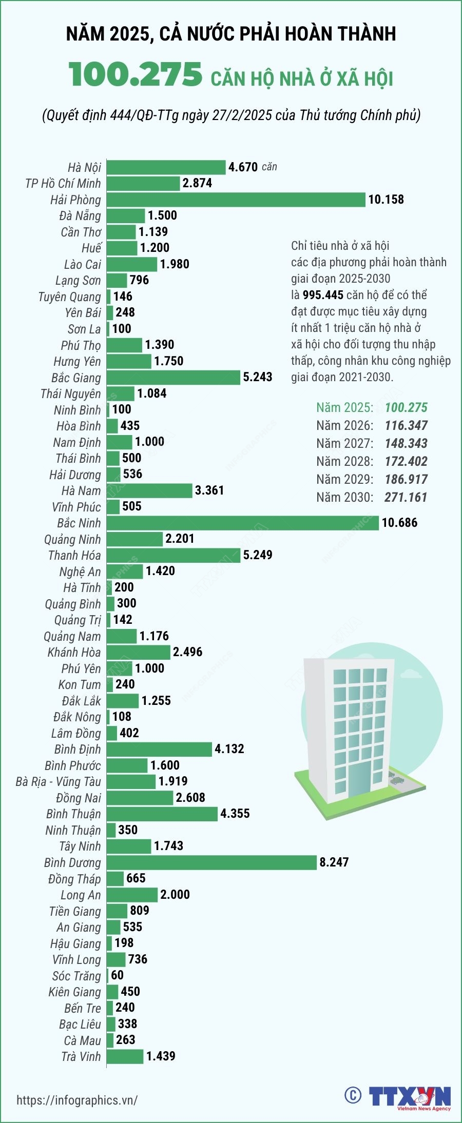 Thủ tướng Chính phủ Phạm Minh Chính vừa ký Quyết định số 444/QĐ-TTg ngày 27/2/2025 giao chỉ tiêu hoàn thành nhà ở xã hội trong năm 2025 và các năm tiếp theo đến năm 2030 để các địa phương bổ sung vào chỉ tiêu phát triển kinh tế-xã hội. Theo đó, giai đoạn 2025-2030, cả nước phải hoàn thành 995.445 căn hộ để có thể đạt được mục tiêu xây dựng ít nhất 1 triệu căn hộ nhà ở xã hội cho đối tượng thu nhập thấp, công nhân khu công nghiệp giai đoạn 2021-2030. Mục tiêu cụ thể của từng năm như sau: năm 2025 là 100.275 căn hộ, năm 2026 là 116.347 căn hộ, năm 2027 là 148.343 căn hộ, năm 2028 là 172.402 căn hộ; năm 2029 là 186.917 căn hộ và năm 2030 là 271.161 căn hộ.