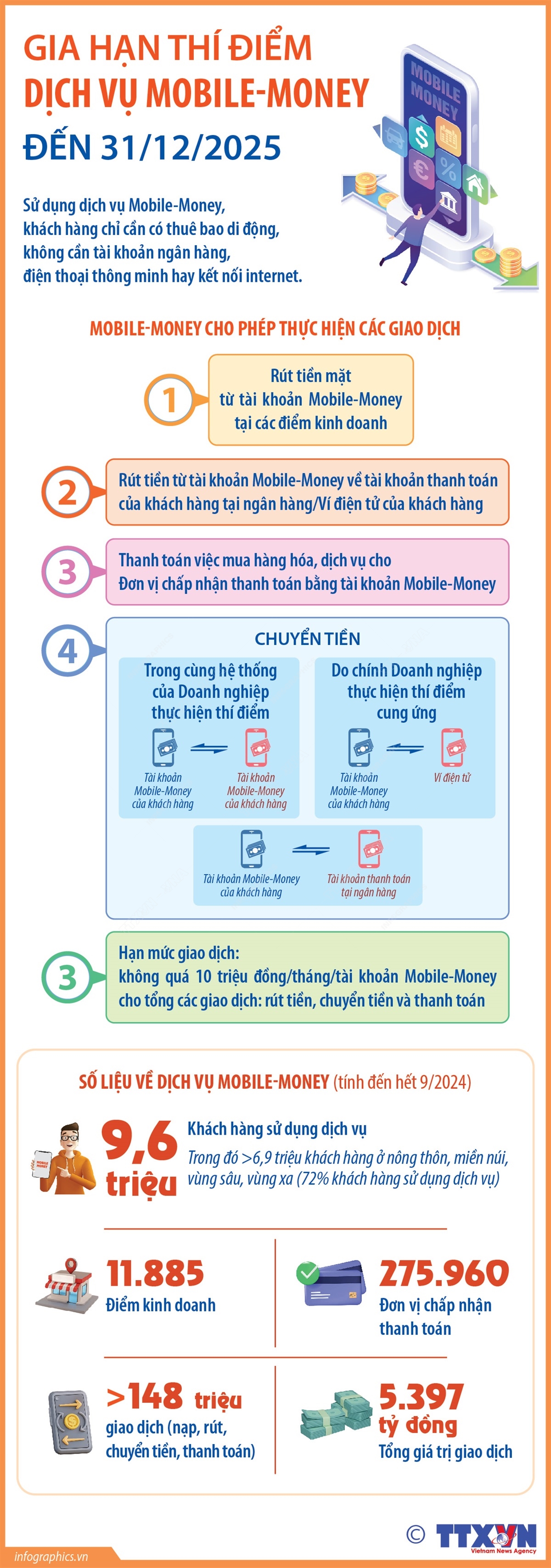 Tại Nghị quyết số 87/NQ-CP ngày 15-4-2025, Chính phủ quyết nghị gia hạn thời gian thực hiện thí điểm dùng tài khoản viễn thông thanh toán cho các hàng hóa, dịch vụ có giá trị nhỏ (Mobile-Money). Theo đó, doanh nghiệp được Ngân hàng Nhà nước Việt Nam chấp thuận thí điểm dùng tài khoản viễn thông thanh toán cho các hàng hóa, dịch vụ có giá trị nhỏ được tiếp tục thí điểm từ ngày 1-1-2025 đến hết ngày 31-12-2025.