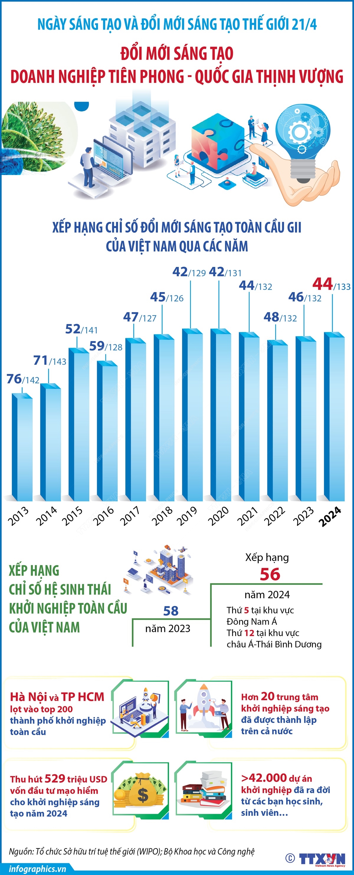 Năm 2017, Đại hội đồng Liên hợp quốc đã chọn ngày 21-4 hằng năm là Ngày Sáng tạo và Đổi mới sáng tạo thế giới với mục đích nhằm nâng cao nhận thức về vai trò của sáng tạo và đổi mới sáng tạo trong phát triển kinh tế, xã hội và phát triển bền vững. Tổ chức Sở hữu trí tuệ thế giới công bố Bộ chỉ số Đổi mới sáng tạo toàn cầu (thường được gọi tắt là GII). Thời gian qua, đất nước ta đã đạt được một số kết quả tích cực về sự phát triển khoa học công nghệ, đổi mới sáng tạo, trong đó có vai trò của hoạt động khởi nghiệp. Chỉ số Đổi mới sáng tạo toàn cầu năm 2024 xếp hạng 44/133 quốc gia và nền kinh tế, tăng 2 bậc so với năm 2023. Chỉ số Hệ sinh thái khởi nghiệp toàn cầu của Việt Nam cũng tăng 2 bậc, từ vị trí 58 lên 56, đứng thứ 5 tại khu vực Đông Nam Á và thứ 12 tại khu vực châu Á - Thái Bình Dương…