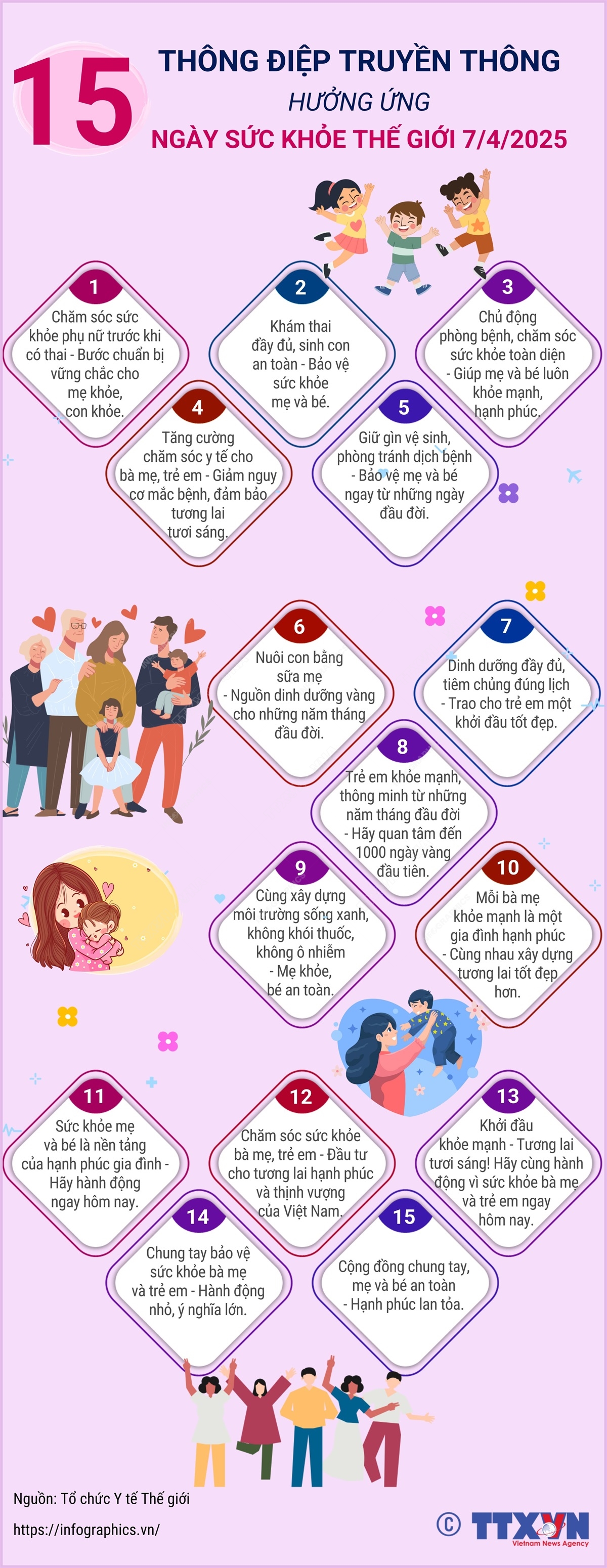 Hưởng ứng Ngày Sức khỏe thế giới (7-4) năm 2025, Tổ chức Y tế thế giới đưa ra chủ đề “Khởi đầu khỏe mạnh, tương lai tươi sáng” (Healthy beginnings, hopeful futures) nhằm thúc đẩy các quốc gia và cộng đồng quốc tế tăng cường những nỗ lực trong việc bảo vệ sức khỏe bà mẹ, trẻ em để dự phòng, hạn chế tối đa nguy cơ mắc bệnh, tử vong ở bà mẹ, trẻ em với ưu tiên mang lại hạnh phúc lâu dài của phụ nữ.