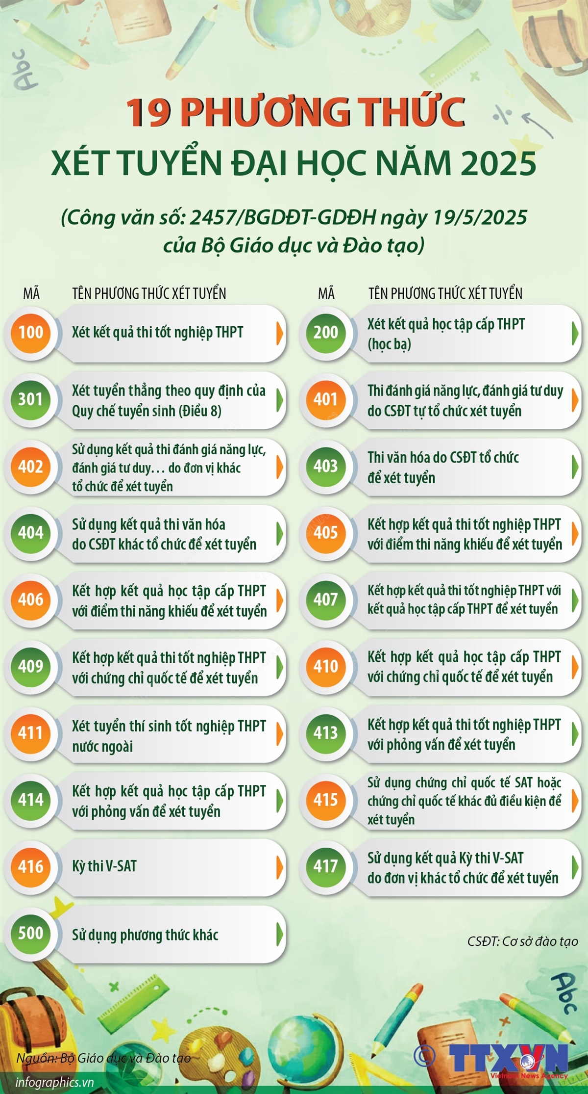 Theo hướng dẫn của Bộ Giáo dục và Đào tạo, tuyển sinh đại học, tuyển sinh cao đẳng năm 2025, có 19 phương thức xét tuyển. Mã phương thức xét tuyển gồm 3 ký tự do cơ sở đào tạo tự định nghĩa nhưng phải tham chiếu với mã phương thức xét tuyển do Bộ Giáo dục và Đào tạo quy định, hoặc có thể sử dụng mã phương thức xét tuyển do Bộ Giáo dục và Đào tạo quy định.