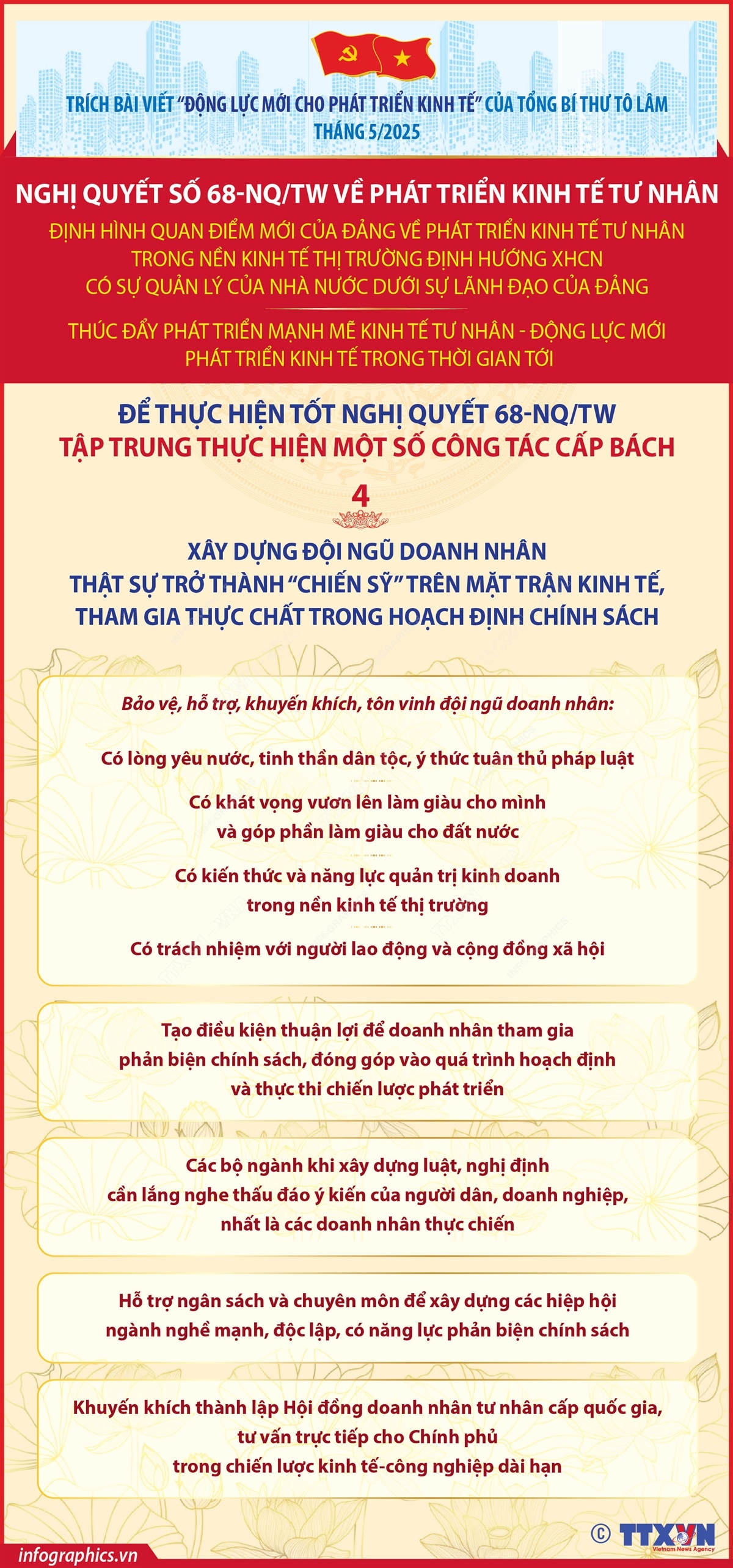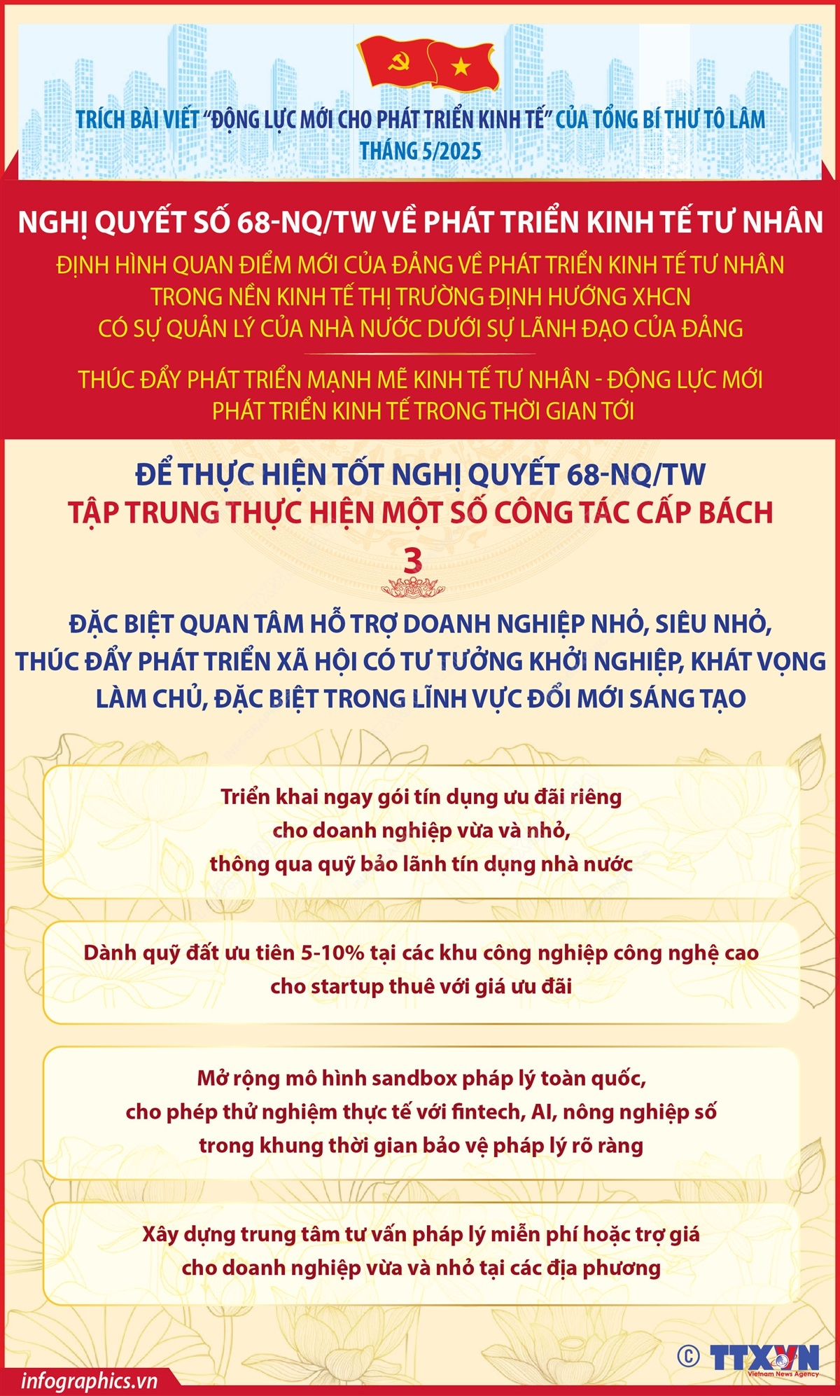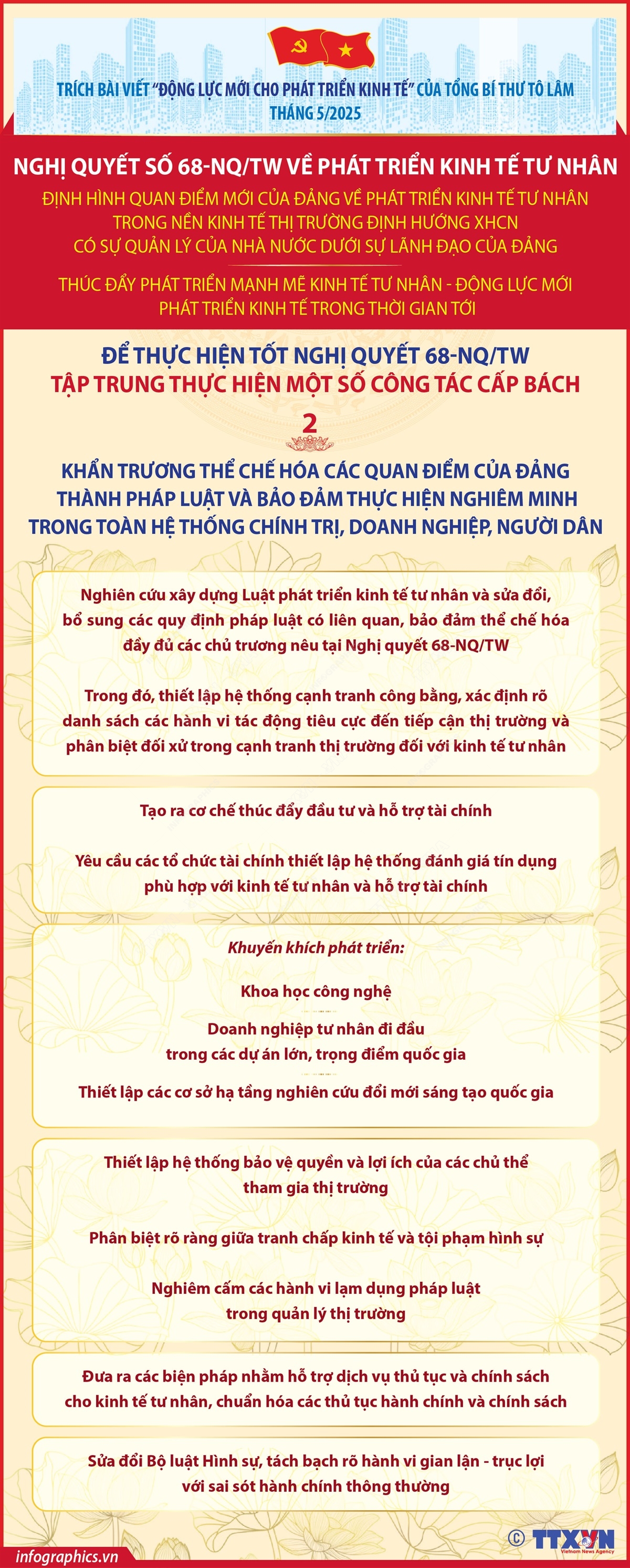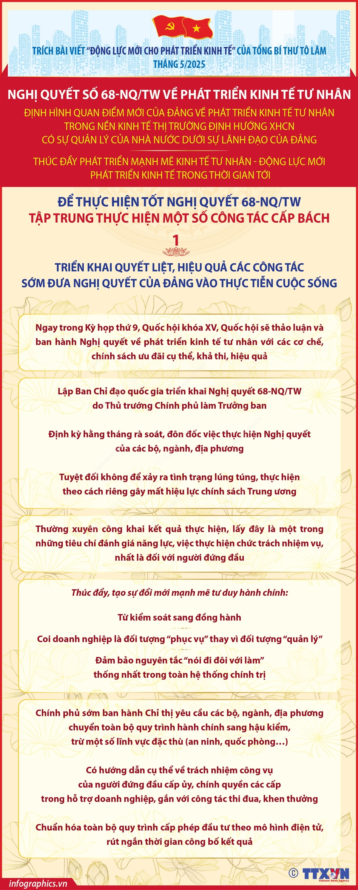 Trong bài viết “Động lực mới cho phát triển kinh tế”, Tổng Bí thư Tô Lâm chỉ rõ: Ngày 4/5/2025, Bộ Chính trị ban hành Nghị quyết số 68-NQ/TW về phát triển kinh tế tư nhân, với các mục tiêu, quan điểm, nhiệm vụ, giải pháp đột phá, chưa từng có tiền lệ; định hình quan điểm mới của Đảng về phát triển kinh tế tư nhân trong nền kinh tế thị trường định hướng xã hội chủ nghĩa có sự quản lý của Nhà nước dưới sự lãnh đạo của Đảng; thúc đẩy phát triển mạnh mẽ kinh tế tư nhân - động lực mới phát triển kinh tế trong thời gian tới. Theo Tổng Bí thư Tô Lâm, để thực hiện thắng lợi Nghị quyết số 68, cần tập trung thực hiện một số công tác cấp bách sau đây: Thứ nhất, triển khai quyết liệt, hiệu quả các công tác sớm đưa Nghị quyết của Đảng vào thực tiễn cuộc sống. Thứ hai, khẩn trương thể chế hoá các quan điểm của Đảng thành pháp luật và bảo đảm thực hiện nghiêm minh trong toàn hệ thống chính trị, doanh nghiệp, người dân. Thứ ba, đặc biệt quan tâm hỗ trợ doanh nghiệp nhỏ, siêu nhỏ, thúc đẩy phát triển xã hội có tư tưởng khởi nghiệp, khát vọng làm chủ, đặc biệt trong lĩnh vực đổi mới sáng tạo. Thứ tư, xây dựng đội ngũ doanh nhân thật sự trở thành “chiến sỹ” trên mặt trận kinh tế, tham gia thực chất trong hoạch định chính sách.