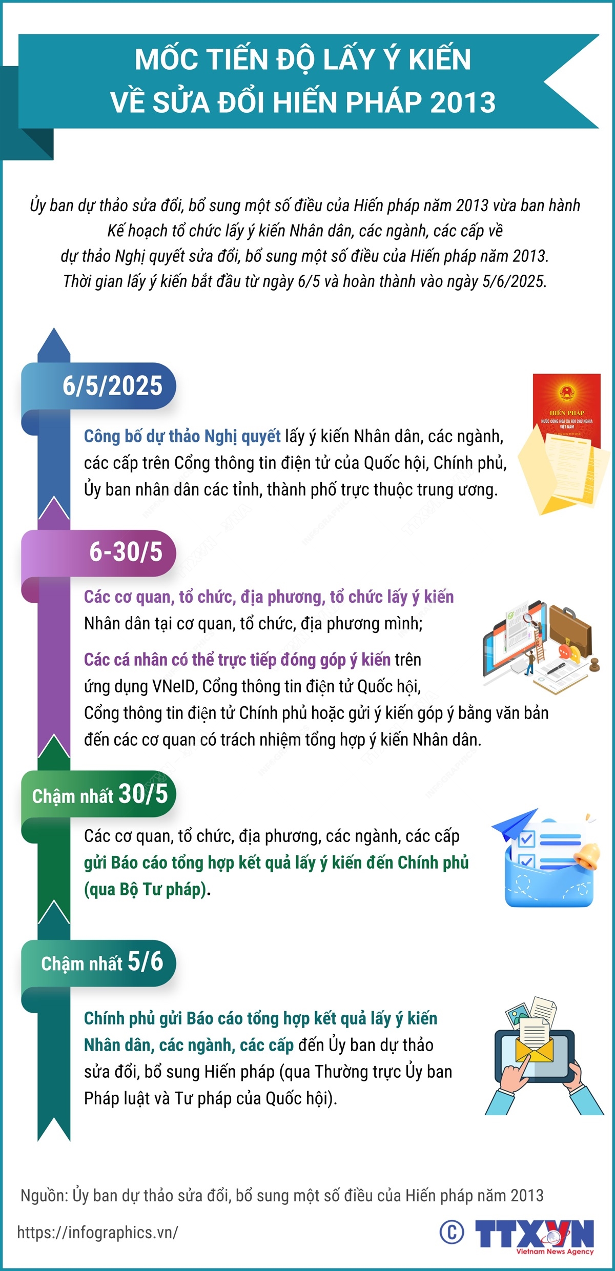 Ủy ban dự thảo sửa đổi, bổ sung một số điều của Hiến pháp năm 2013 vừa ban hành Kế hoạch tổ chức lấy ý kiến Nhân dân, các ngành, các cấp về dự thảo Nghị quyết sửa đổi, bổ sung một số điều của Hiến pháp năm 2013. Thời gian lấy ý kiến bắt đầu từ ngày 6/5/2025 và hoàn thành vào ngày 5/6/2025.