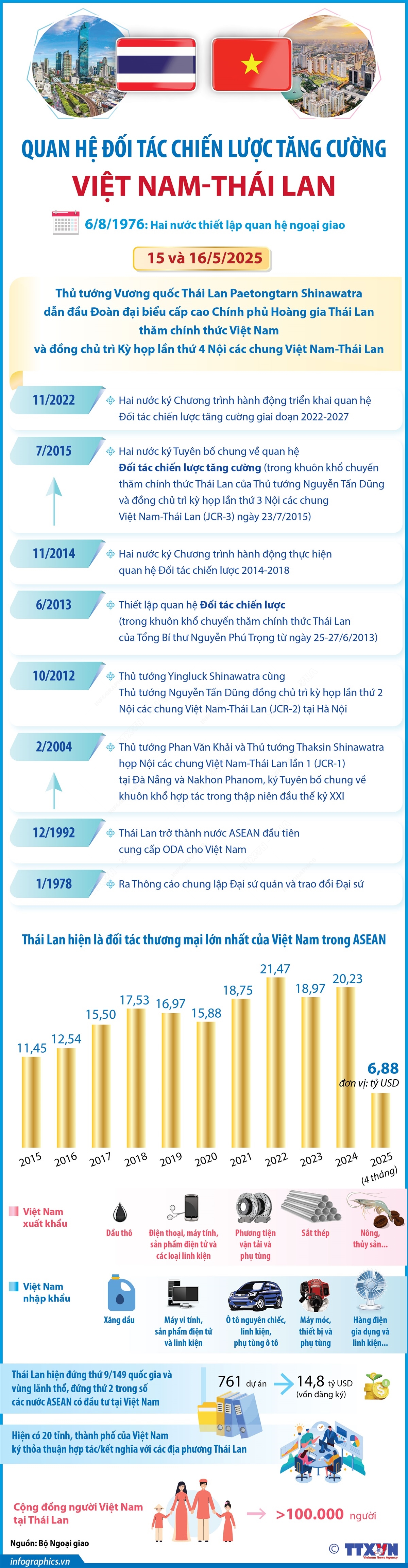 Nhận lời mời của Thủ tướng Chính phủ Phạm Minh Chính, Thủ tướng Vương quốc Thái Lan Paetongtarn Shinawatra dẫn đầu Đoàn đại biểu cấp cao Chính phủ Hoàng gia Thái Lan thăm chính thức Việt Nam và đồng chủ trì Kỳ họp lần thứ 4 Nội các chung Việt Nam - Thái Lan vào ngày 15 và 16/5/2025.