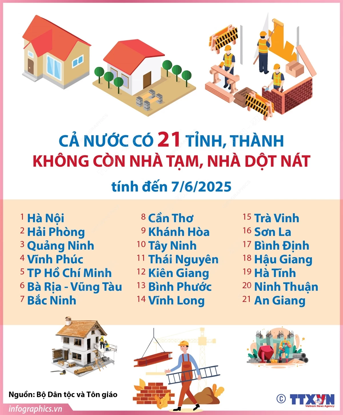 Theo thông tin từ Bộ Dân tộc và Tôn giáo, tính đến hết ngày 7/6/2025, cả nước có 21 địa phương không còn nhà tạm, nhà dột nát, gồm: Hà Nội, Hải Phòng, Quảng Ninh, Vĩnh Phúc, TP Hồ Chí Minh, Bà Rịa - Vũng Tàu, Bắc Ninh, Cần Thơ, Khánh Hòa, Tây Ninh, Thái Nguyên, Kiên Giang, Bình Phước, Vĩnh Long, Trà Vinh, Sơn La, Bình Định, Hậu Giang, Hà Tĩnh, Ninh Thuận, An Giang.