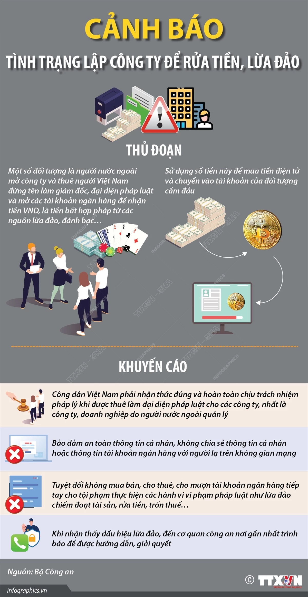 Bộ Công an cảnh báo tình trạng thuê người Việt Nam mở tài khoản ngân hàng, lập công ty để rửa tiền cho các đường dây lừa đảo, chiếm đoạt tài sản. Tình trạng này đang diễn biến phức tạp, gây nhiều hệ lụy nghiêm trọng cho xã hội và đẩy nạn nhân bị lợi dụng vào vòng lao lý.