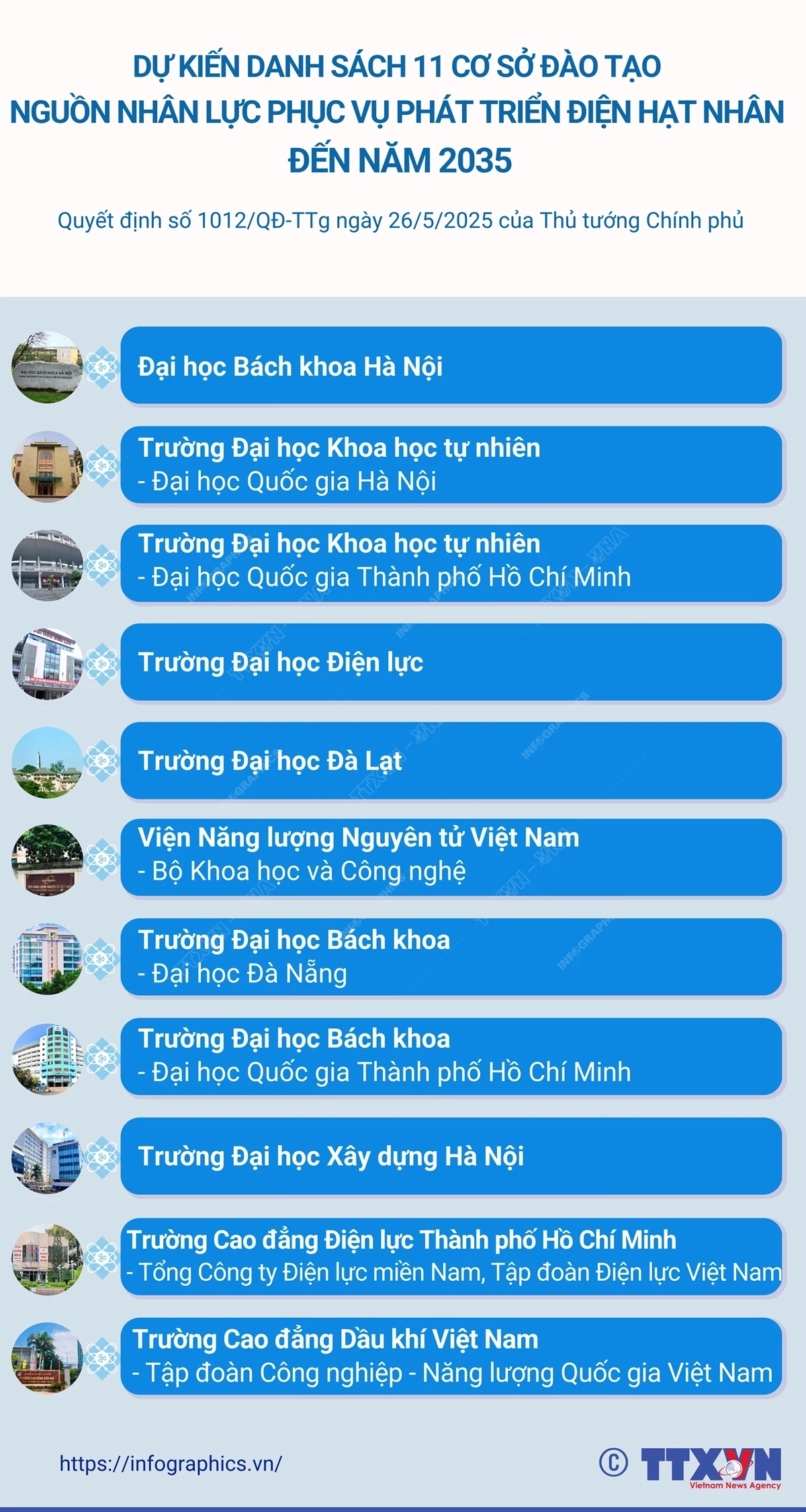 Theo Đề án "Đào tạo, bồi dưỡng nguồn nhân lực phục vụ phát triển điện hạt nhân đến năm 2035", dự kiến có 11 cơ sở đào tạo nguồn nhân lực sẽ đào tạo, bồi dưỡng nguồn nhân lực trong nước và nước ngoài đáp ứng cho nhu cầu phục vụ nhà máy điện hạt nhân Ninh Thuận 1 và Ninh Thuận 2. 11 cơ sở đào tạo gồm các đại học, viện, trường đại học, trường cao đẳng. Đề án "Đào tạo, bồi dưỡng nguồn nhân lực phục vụ phát triển điện hạt nhân đến năm 2035" được Thủ tướng Chính phủ phê duyệt tại Quyết định số 1012/QĐ-TTg ngày 26/5/2025.
