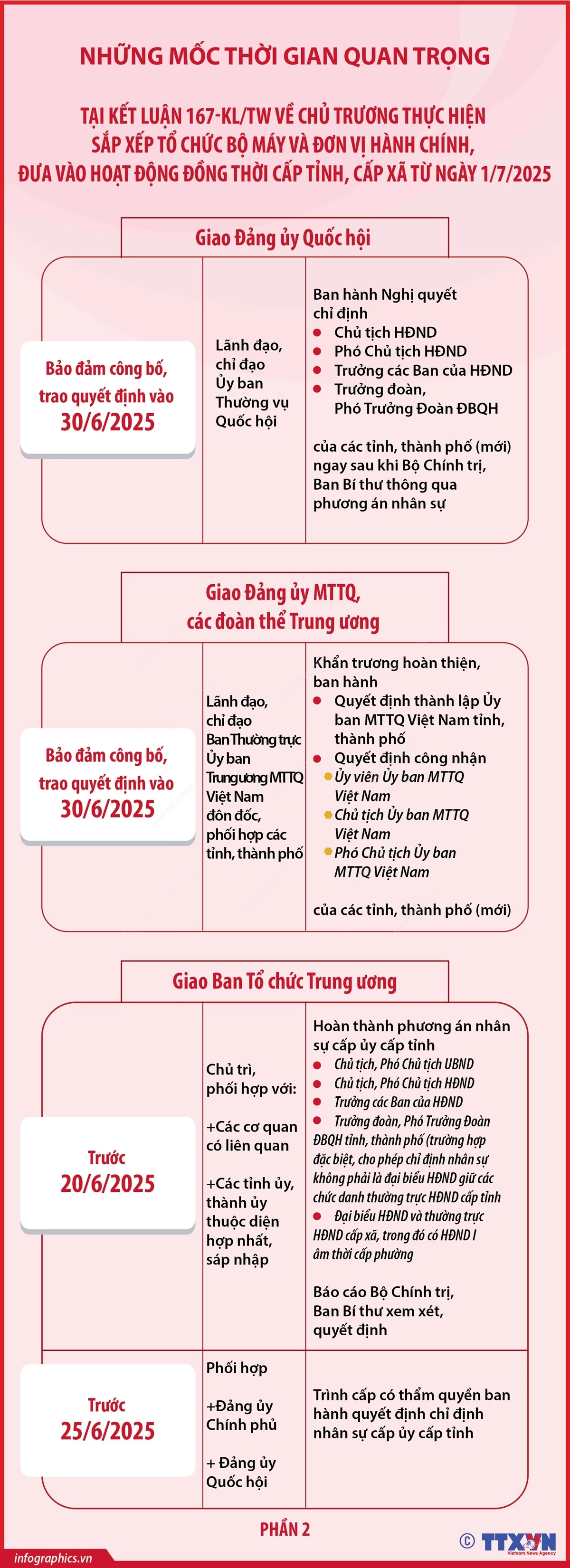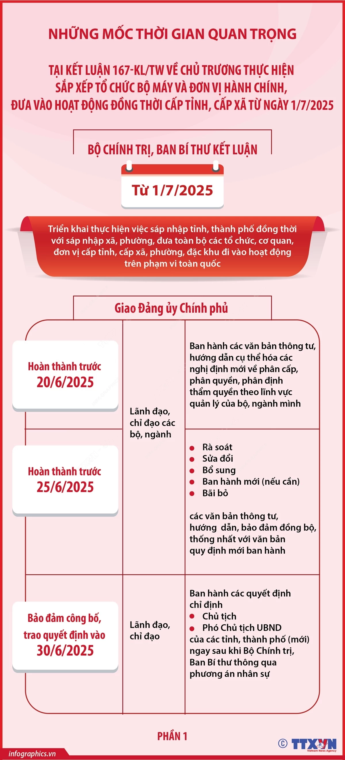 Thay mặt Bộ Chính trị, Ủy viên Bộ Chính trị, Thường trực Ban Bí thư Trần Cẩm Tú vừa ký ban hành Kết luận số 167-KL/TW (ngày 13/6/2025) của Bộ Chính trị, Ban Bí thư về chủ trương thực hiện sắp xếp tổ chức bộ máy và đơn vị hành chính, đưa vào hoạt động đồng thời cấp tỉnh, cấp xã từ ngày 1/7/2025 (gọi tắt là Kết luận số 167). Theo đó, Bộ Chính trị, Ban Bí thư kết luận: Quyết định triển khai thực hiện việc sáp nhập tỉnh, thành phố đồng thời với sáp nhập xã, phường, đưa toàn bộ các tổ chức, cơ quan, đơn vị cấp tỉnh, cấp xã, phường, đặc khu đi vào hoạt động trên phạm vi toàn quốc từ ngày 1/7/2025.