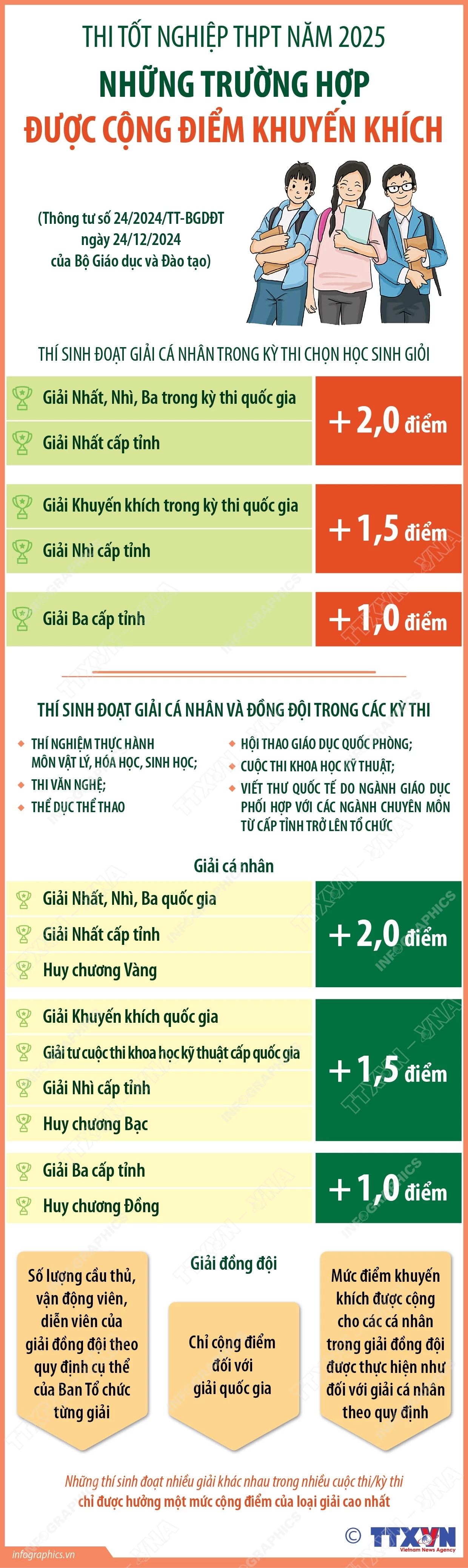 Quy chế thi tốt nghiệp Trung học phổ thông năm 2025 được Bộ Giáo dục và Đào tạo ban hành kèm Thông tư số 24/2024/TT-BGDĐT ngày 24/12/2024 quy định rõ các trường hợp thí sinh được cộng điểm khuyến khích. Theo quy định, thí sinh được cộng điểm khuyến khích để xét công nhận tốt nghiệp trung học phổ thông với mức cộng điểm khuyến khích cao nhất có thể được cộng là 2 điểm. Trường hợp thí sinh được nhiều giải khác nhau trong nhiều kỳ thi/cuộc thi thì chỉ được hưởng một mức cộng điểm của giải cao nhất.