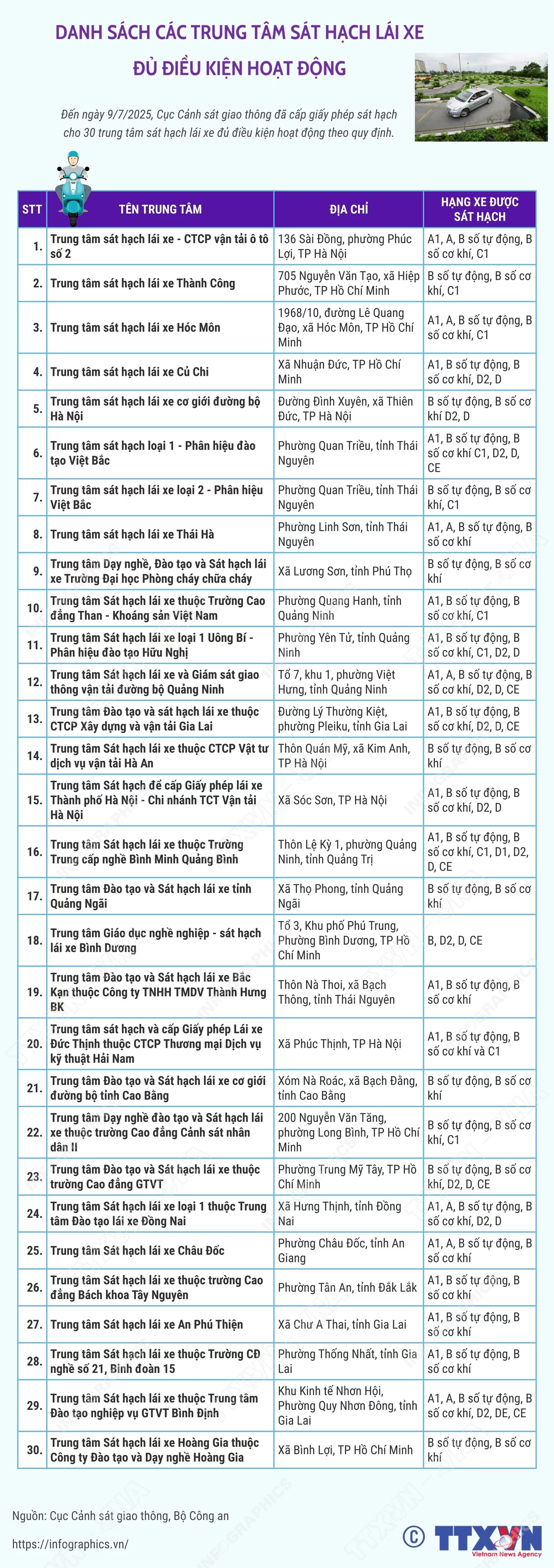 Đến ngày 9/7/2025, Cục Cảnh sát giao thông (Bộ Công an) đã cấp Giấy phép sát hạch cho 30 Trung tâm sát hạch lái xe đủ điều kiện hoạt động theo quy định.