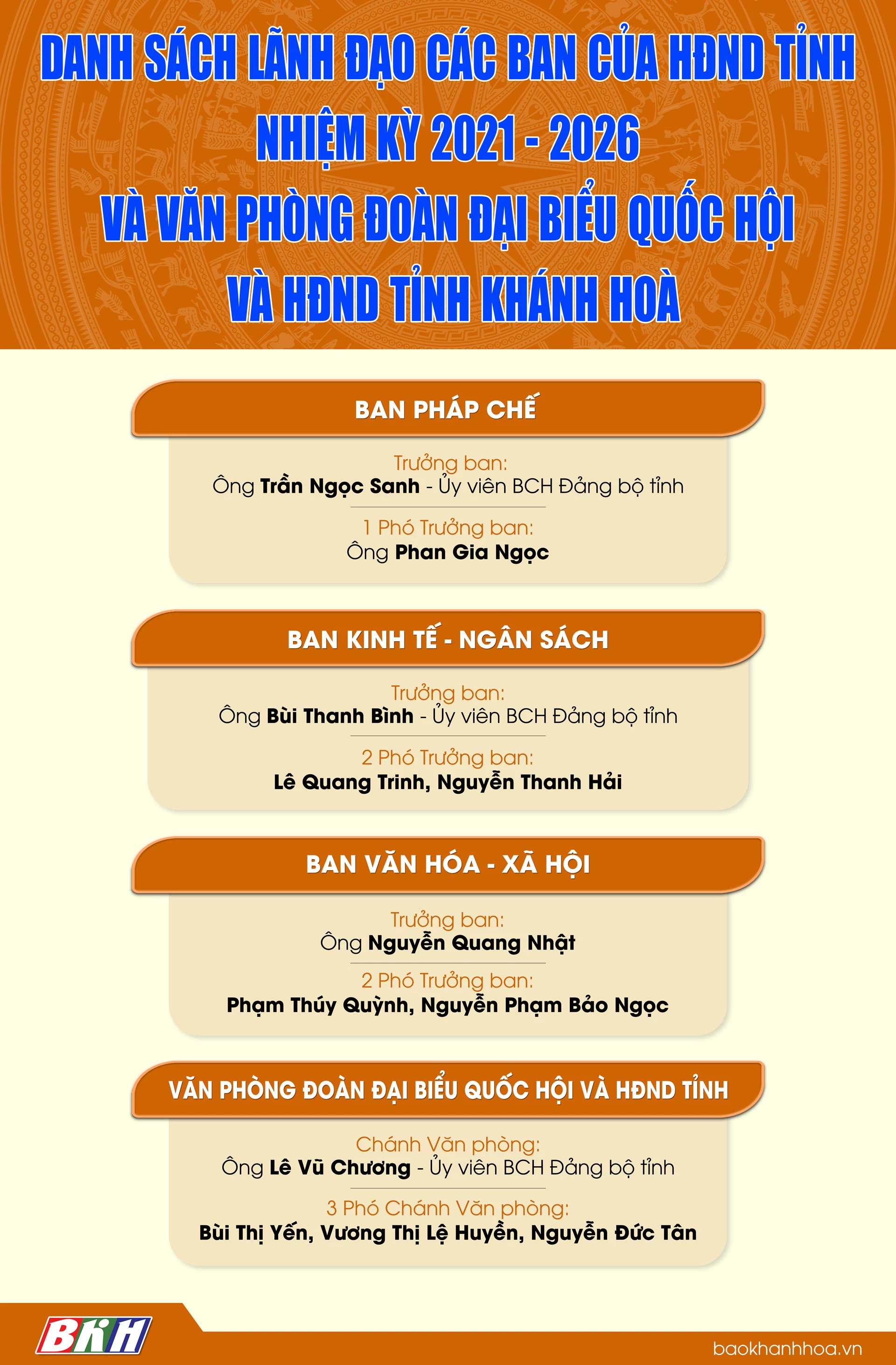 Danh sách lãnh đạo các ban của HĐND tỉnh nhiệm kỳ 2021 - 2026 và Văn phòng Đoàn Đại biểu Quốc hội và HĐND tỉnh Khánh Hòa