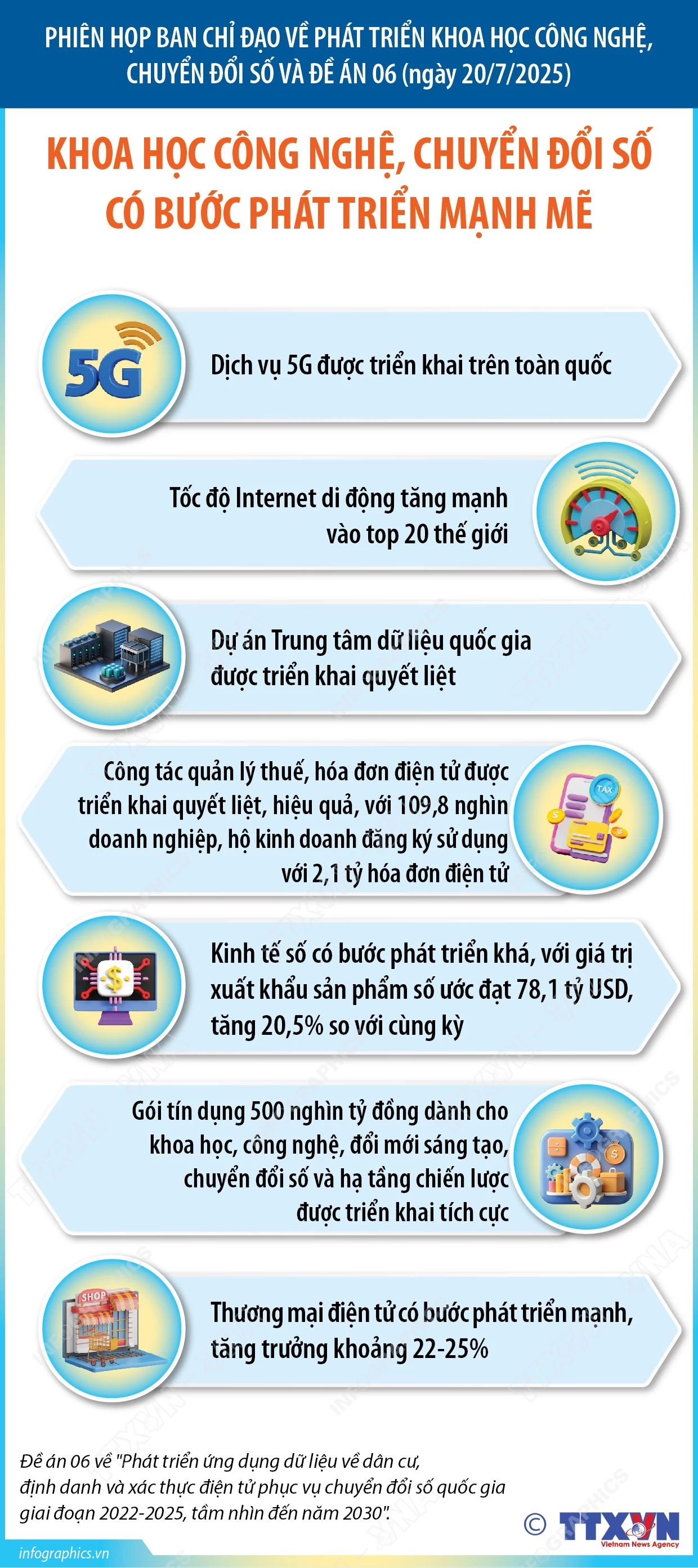 Sáng 20/7/2025, Thủ tướng Chính phủ Phạm Minh Chính, Trưởng Ban Chỉ đạo của Chính phủ về phát triển khoa học, công nghệ, đổi mới sáng tạo, chuyển đổi số và đề án 06 (Ban Chỉ đạo), chủ trì Phiên họp thứ Ba của Ban Chỉ đạo để sơ kết công tác 6 tháng đầu năm, triển khai nhiệm vụ 6 tháng cuối năm 2025. Đánh giá kết quả đạt được thời gian qua, Thủ tướng cho rằng, công tác lãnh đạo, chỉ đạo điều hành được triển khai quyết liệt và được tổ chức thực hiện đồng bộ với quyết tâm cao từ Trung ương đến cơ sở. Cơ bản đã hoàn thiện về thể chế, cơ chế, chính sách tạo hành lang pháp lý cho khoa học, công nghệ, đổi mới sáng tạo, chuyển đổi số và Đề án 06. Khoa học, công nghệ, đổi mới sáng tạo, chuyển đổi số và phát triển kinh tế số có bước phát triển mạnh mẽ: dịch vụ 5G trên toàn quốc được triển khai toàn quốc; tốc độ Internet di động tăng mạnh vào top 20 thế giới; dự án Trung tâm dữ liệu quốc gia được triển khai quyết liệt.