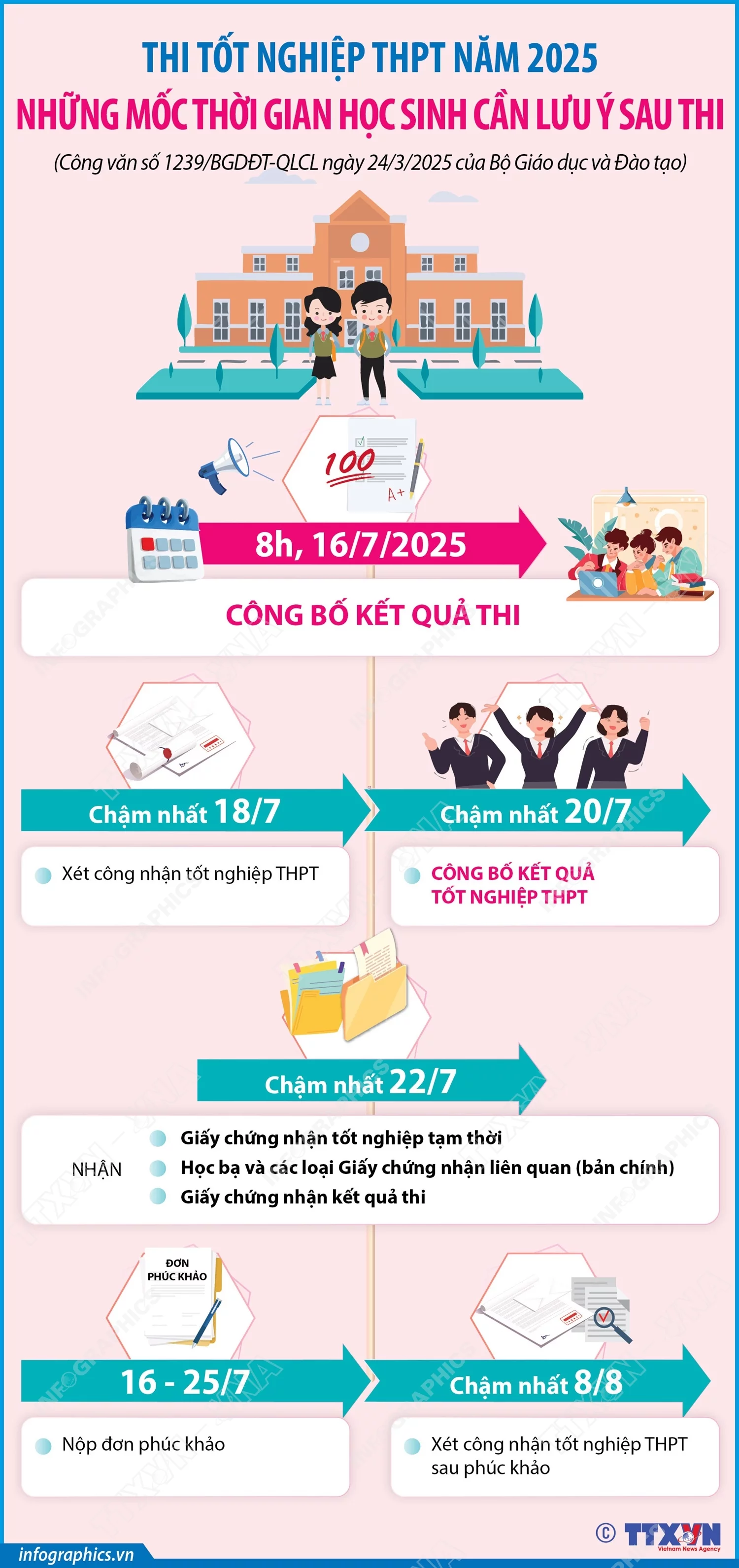 Điểm thi tốt nghiệp THPT năm 2025 sẽ được công bố vào 8 giờ ngày 16/7/2025. Sau khi điểm thi được công bố, thí sinh cần lưu ý những mốc thời gian quan trọng như: Thời gian nhận giấy chứng nhận kết quả thi tốt nghiệp THPT, nộp đơn phúc khảo (nếu có), nhận giấy chứng nhận kết quả thi, học bạ và các loại Giấy chứng nhận liên quan…