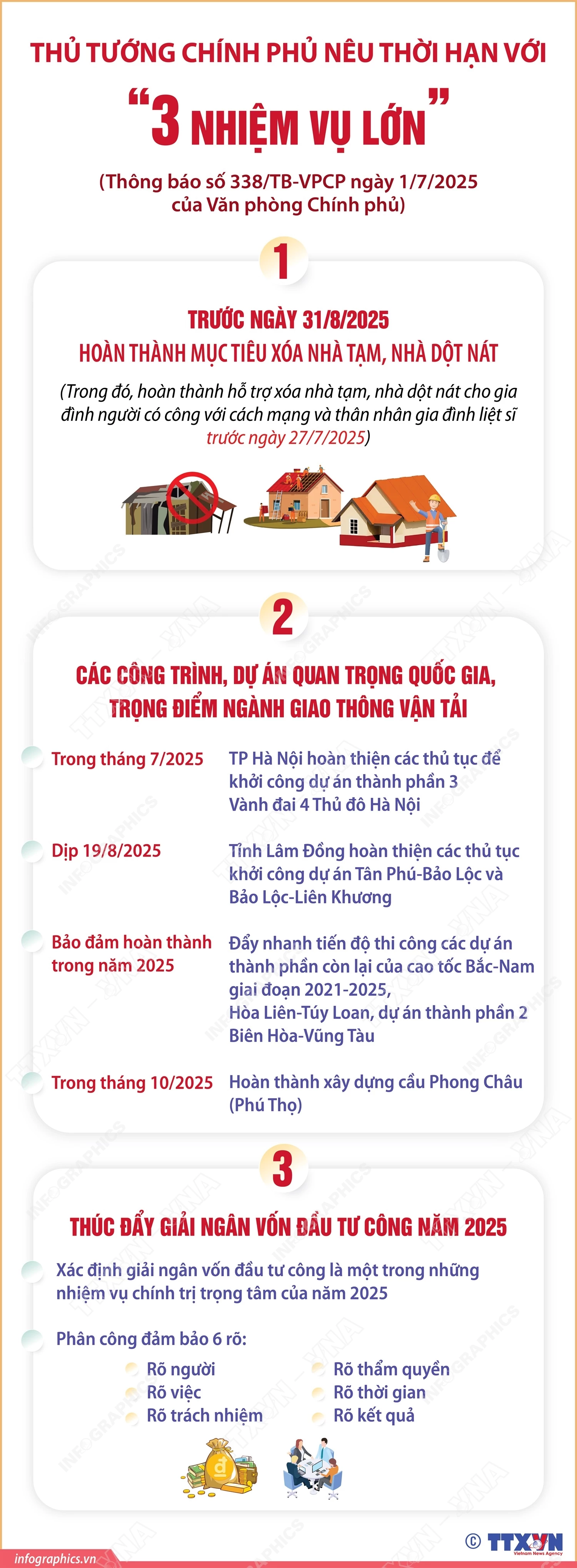 Theo Thông báo số 338/TB-VPCP ngày 1/7/2025 của Văn phòng Chính phủ, Thủ tướng Chính phủ Phạm Minh Chính đã có chỉ đạo cụ thể về tiến độ đối với các công tác: xóa nhà tạm, nhà dột nát trên phạm vi cả nước; các công trình, dự án quan trọng quốc gia, trọng điểm ngành giao thông vận tải; thúc đẩy giải ngân vốn đầu tư công năm 2025. Thủ tướng Chính phủ chỉ đạo các bộ ngành, địa phương quyết tâm hoàn thành cơ bản mục tiêu xóa nhà tạm, nhà dột nát trên phạm vi cả nước trước ngày 31/8/2025; trong đó, hỗ trợ nhà ở cho thân nhân liệt sĩ, người có công với cách mạng, hoàn thành trước ngày 27/7/2025. TP Hà Nội, tỉnh Lâm Đồng hoàn thiện các thủ tục để khởi công dự án thành phần 3 Vành đai 4 Thủ đô Hà Nội trong tháng 7/2025, dự án Tân Phú-Bảo Lộc và Bảo Lộc-Liên Khương dịp 19/8/2025; đẩy nhanh tiến độ thi công các dự án thành phần còn lại của cao tốc Bắc-Nam giai đoạn 2021-2025, Hòa Liên-Túy Loan, dự án thành phần 2 Biên Hòa-Vũng Tàu, bảo đảm hoàn thành trong năm 2025… Đối với nhiệm vụ giải ngân vốn đầu tư công, Thủ tướng nêu rõ đẩy nhanh tiến độ giải ngân vốn đầu tư công phải đi đôi với bảo đảm chất lượng, kỹ thuật, mỹ thuật công trình, an toàn vệ sinh lao động, không đội vốn, chống tham nhũng, tiêu cực, thất thoát, lãng phí; xác định giải ngân vốn đầu tư công là một trong những nhiệm vụ trọng tâm của năm 2025.