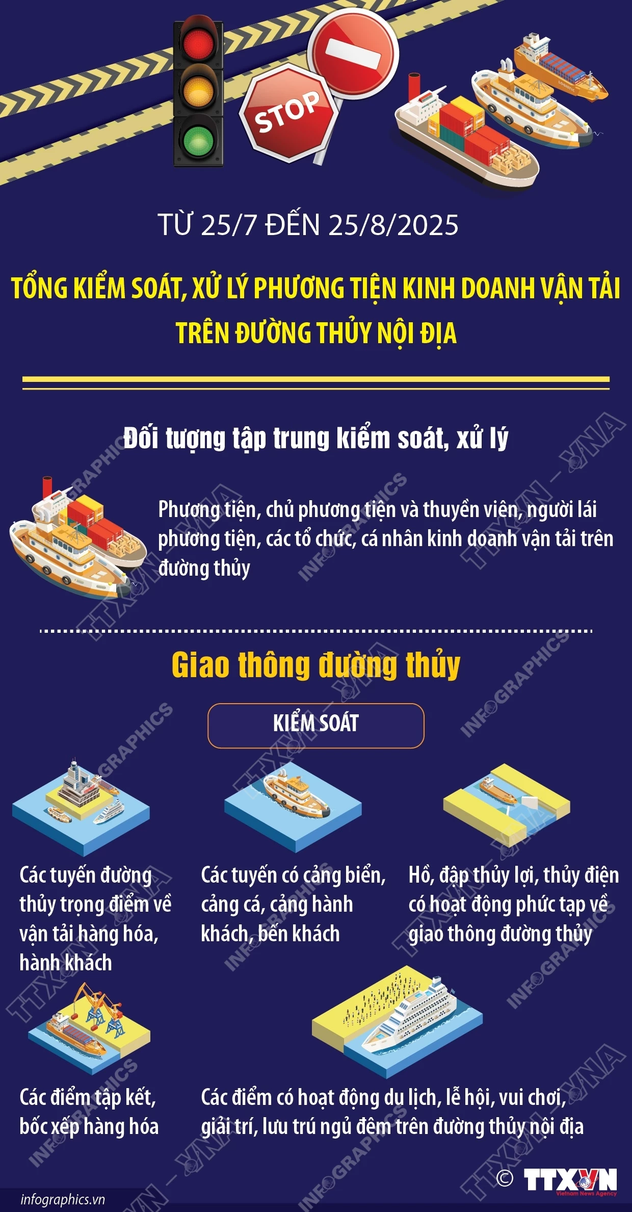 Trong một tháng, từ nay đến ngày 25/8/2025, lực lượng CSGT trên cả nước sẽ đồng loạt tổng kiểm soát phương tiện kinh doanh vận tải trên tất cả tuyến đường thủy nội địa. Đối tượng tập trung rà soát là các phương tiện, chủ phương tiện và thuyền viên, người lái, các tổ chức, cá nhân kinh doanh vận tải đường thủy.