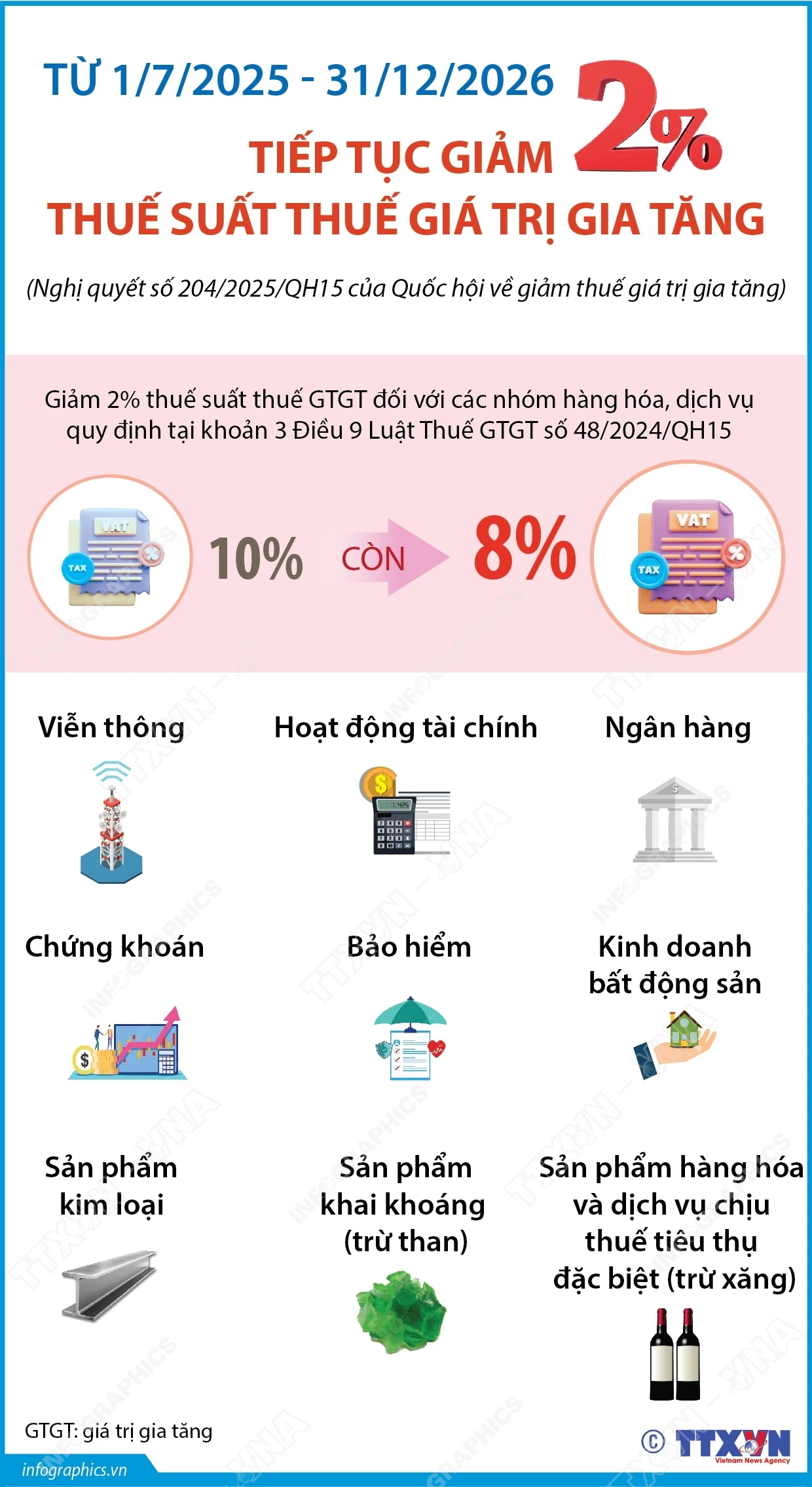 Chủ tịch Quốc hội Trần Thanh Mẫn đã ký ban hành Nghị quyết số 204/2025/QH15 của Quốc hội về giảm thuế giá trị gia tăng. Theo đó, Quốc hội quyết nghị giảm 2% thuế suất thuế giá trị gia tăng, áp dụng đối với các nhóm hàng hóa, dịch vụ quy định tại khoản 3, Điều 9 của Luật Thuế giá trị gia tăng số 48/2024/QH15 (còn 8%), trừ một số nhóm hàng hóa, dịch vụ sau: viễn thông, hoạt động tài chính, ngân hàng, chứng khoán, bảo hiểm, kinh doanh bất động sản, sản phẩm kim loại, sản phẩm khai khoáng (trừ than), sản phẩm hàng hóa và dịch vụ chịu thuế tiêu thụ đặc biệt (trừ xăng). Nghị quyết này có hiệu lực thi hành từ ngày 1/7/2025 đến hết ngày 31/12/2026.