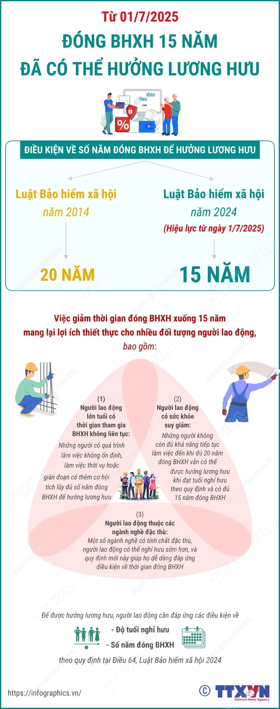 Từ ngày 1/7/2025, người tham gia đóng bảo hiểm xã hội (BHXH) từ đủ 15 năm đã có thể được hưởng lương hưu hằng tháng thay vì 20 năm như trước. Đây là một thay đổi lớn trong chính sách BHXH được quy định tại Luật Bảo hiểm xã hội năm 2024, mở ra cơ hội nhận lương hưu cho nhiều người đã và đang tham gia đóng BHXH theo cả hai hình thức bắt buộc và nguyện.