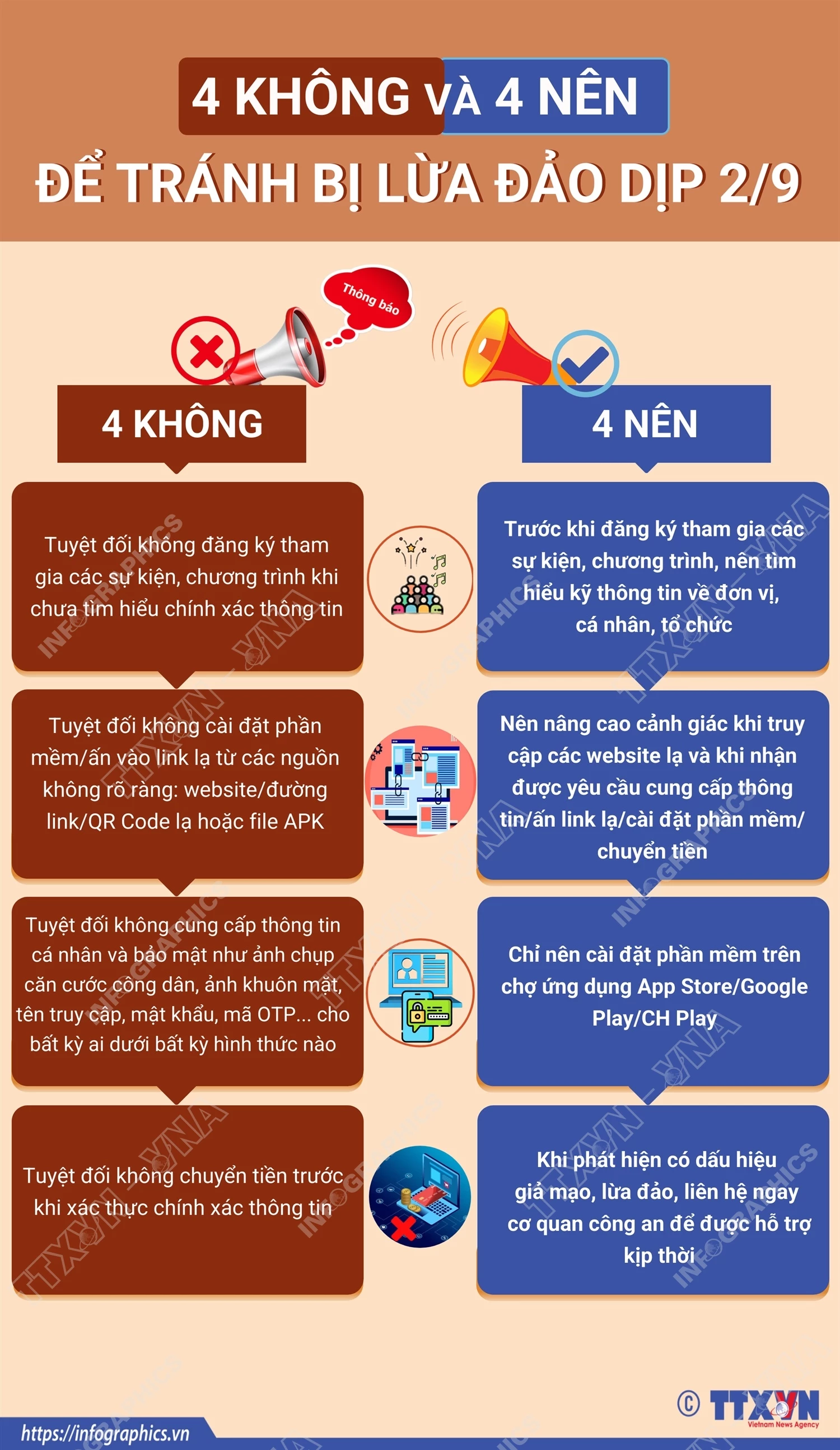 Theo thông báo từ các cơ quan quản lý nhà nước về giám sát an toàn, an ninh mạng, các cơ quan chức năng đã phát hiện tình trạng các đối tượng lợi dụng bối cảnh cả nước hân hoan chào đón và tổ chức nhiều chương trình chào mừng, kỷ niệm 80 năm Cách mạng Tháng Tám và Quốc khánh 2/9, để mạo danh các cơ quan, tổ chức, từ đó, dụ dỗ, thu thập thông tin cá nhân, lừa đảo, chiếm đoạt tài sản của người dân. Cơ quan công an khuyến cáo người dân thực hiện 4 KHÔNG và 4 NÊN.