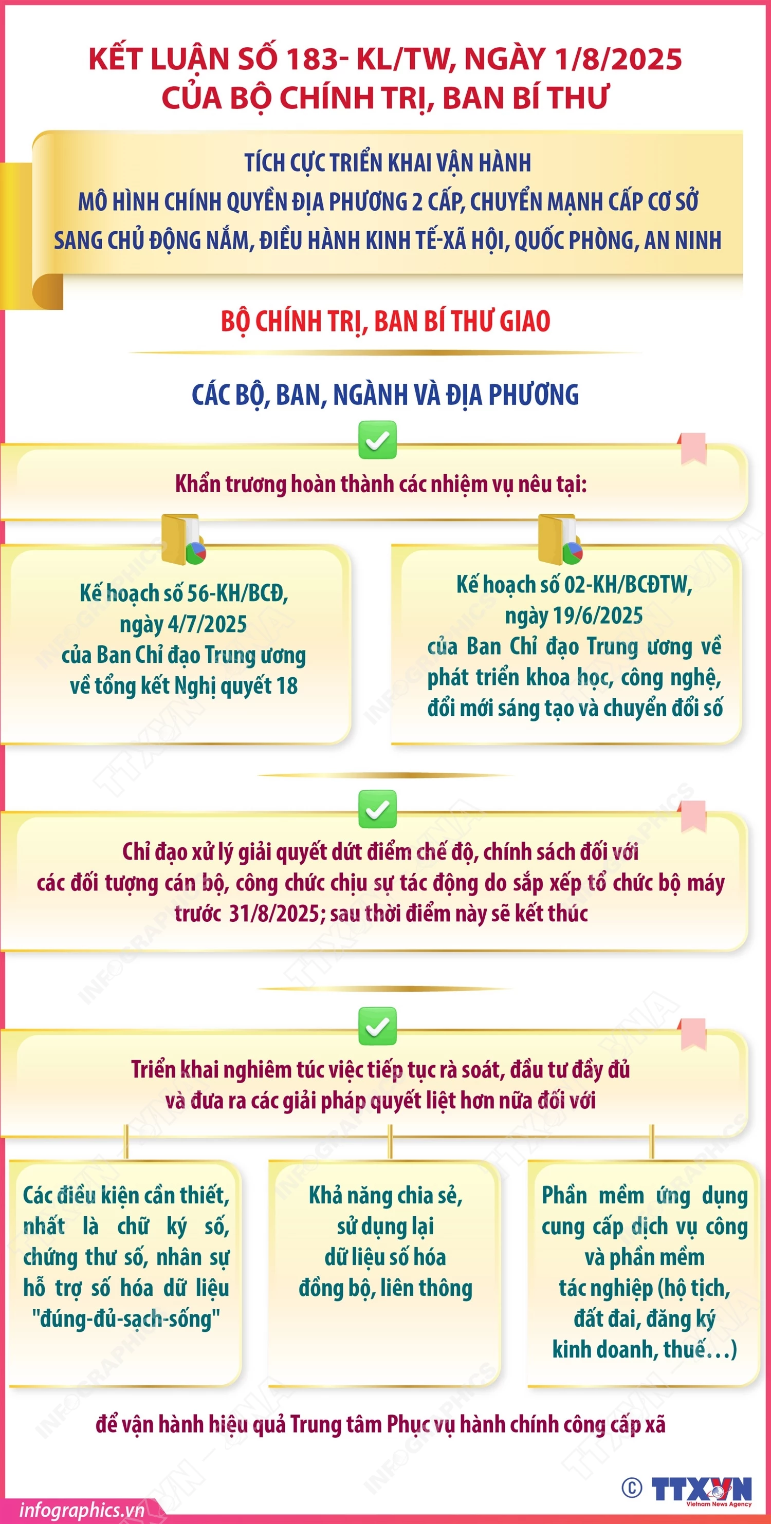 Thay mặt Bộ Chính trị, Thường trực Ban Bí thư Trần Cẩm Tú ký ban hành Kết Luận số 183- KL/TW, ngày 1/8/2025 của Bộ Chính trị, Ban Bí thư về tích cực triển khai vận hành mô hình chính quyền địa phương 2 cấp, chuyển mạnh cấp cơ sở sang chủ động nắm, điều hành kinh tế-xã hội, quốc phòng, an ninh. Bộ Chính trị, Ban Bí thư giao các bộ, ban, ngành và địa phương khẩn trương hoàn thành các nhiệm vụ nêu tại Kế hoạch số 56-KH/BCĐ, ngày 4/7/2025 của Ban Chỉ đạo Trung ương về tổng kết Nghị quyết 18 và Kế hoạch số 02-KH/BCĐTW, ngày 19/6/2025 của Ban Chỉ đạo Trung ương về phát triển khoa học, công nghệ, đổi mới sáng tạo và chuyển đổi số. Chỉ đạo xử lý giải quyết dứt điểm chế độ, chính sách đối với các đối tượng cán bộ, công chức chịu sự tác động do sắp xếp tổ chức bộ máy trước ngày 31/8/2025; sau thời điểm này sẽ kết thúc…