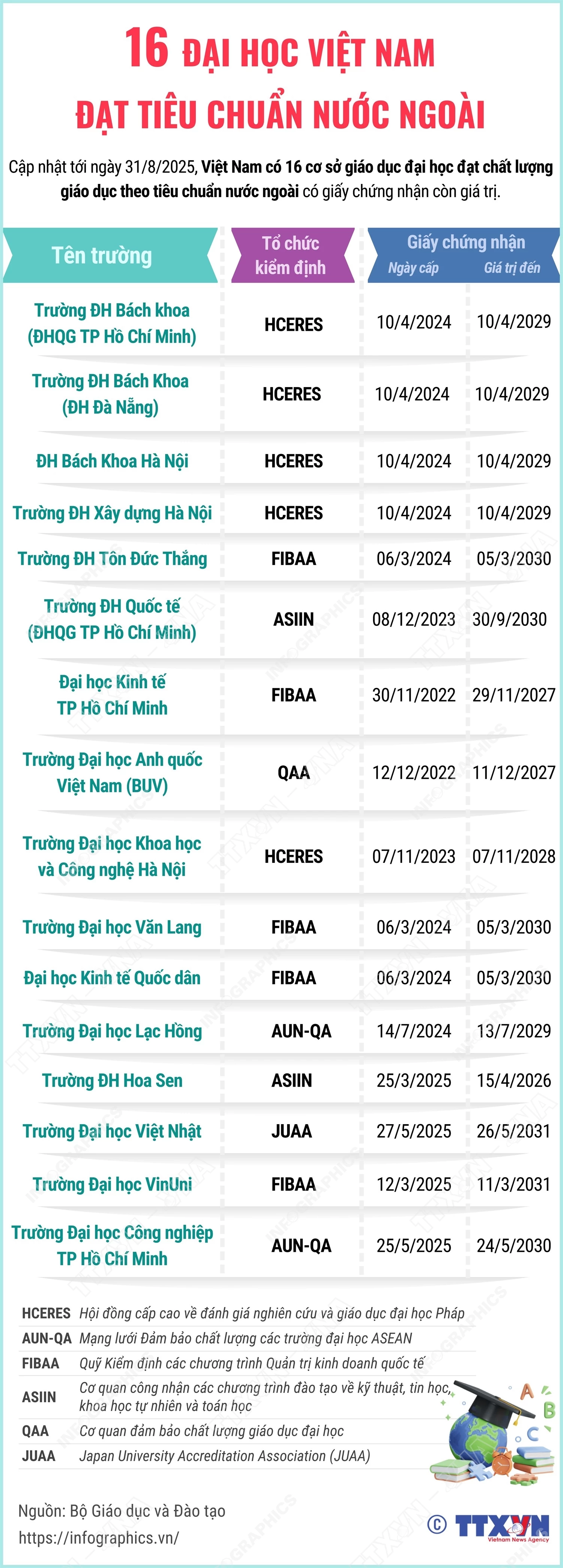 Cập nhật tới ngày 31/8/2025, Việt Nam có 16 cơ sở giáo dục đại học đạt chất lượng giáo dục theo tiêu chuẩn nước ngoài có giấy chứng nhận còn giá trị.