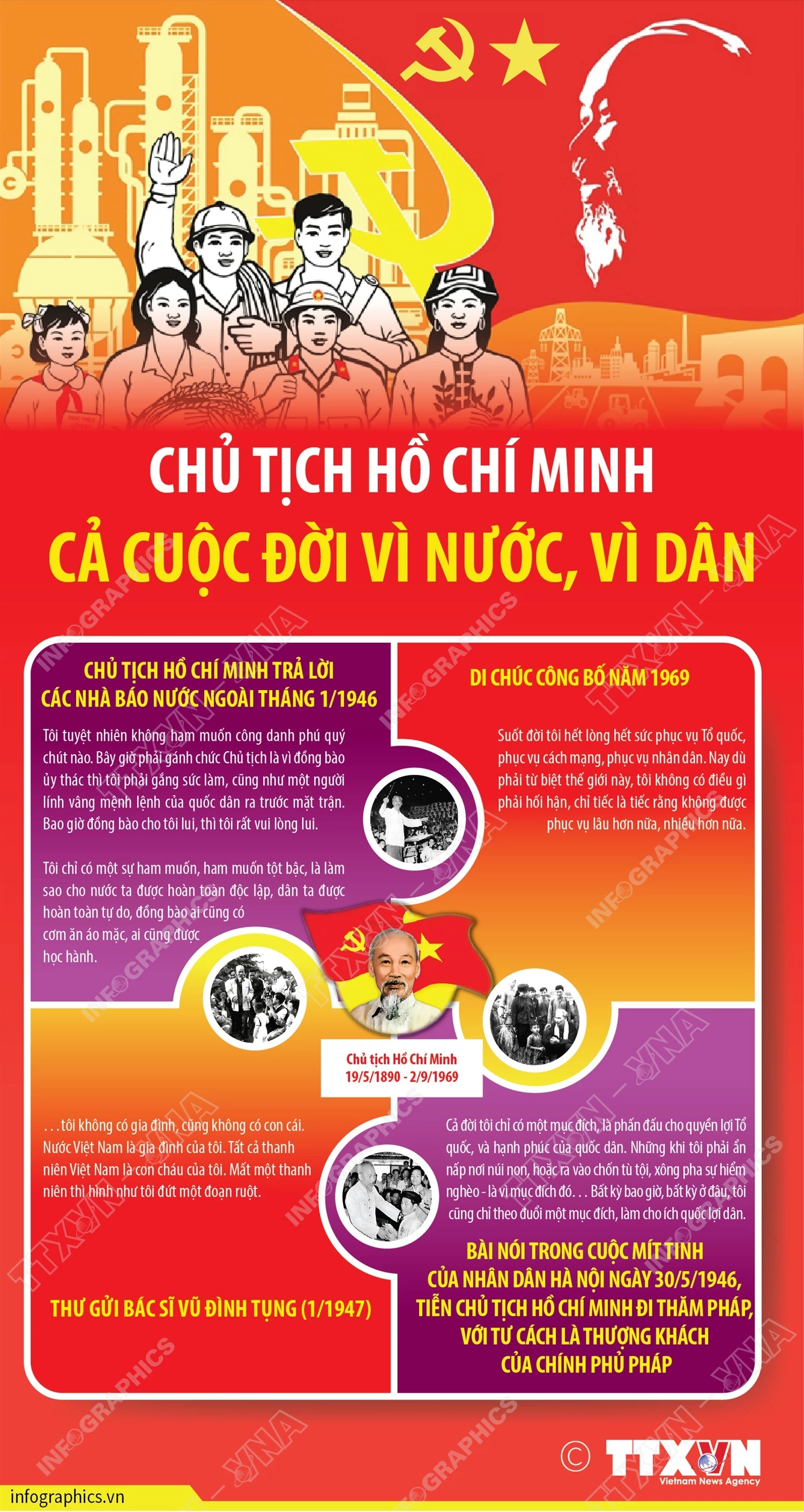Người không chỉ làm nên lịch sử mà còn để lại di sản tinh thần vô giá cho dân tộc Việt Nam. Người là biểu tượng sinh động nhất cho khát vọng tự do, là cội nguồn mọi thắng lợi của đất nước. Người đã để lại cho toàn Đảng, toàn dân ta một di sản cao quý, đó là tấm gương sáng ngời về phẩm chất đạo đức của người cách mạng - phẩm chất tận trung với nước, tận hiếu với dân. Đó là tài sản tinh thần vô giá mà Đảng, Nhà nước và Nhân dân ta nguyện suốt đời học tập, làm theo, là ngọn đèn soi sáng cho con đường phát triển bền vững của đất nước hôm nay và mai sau.