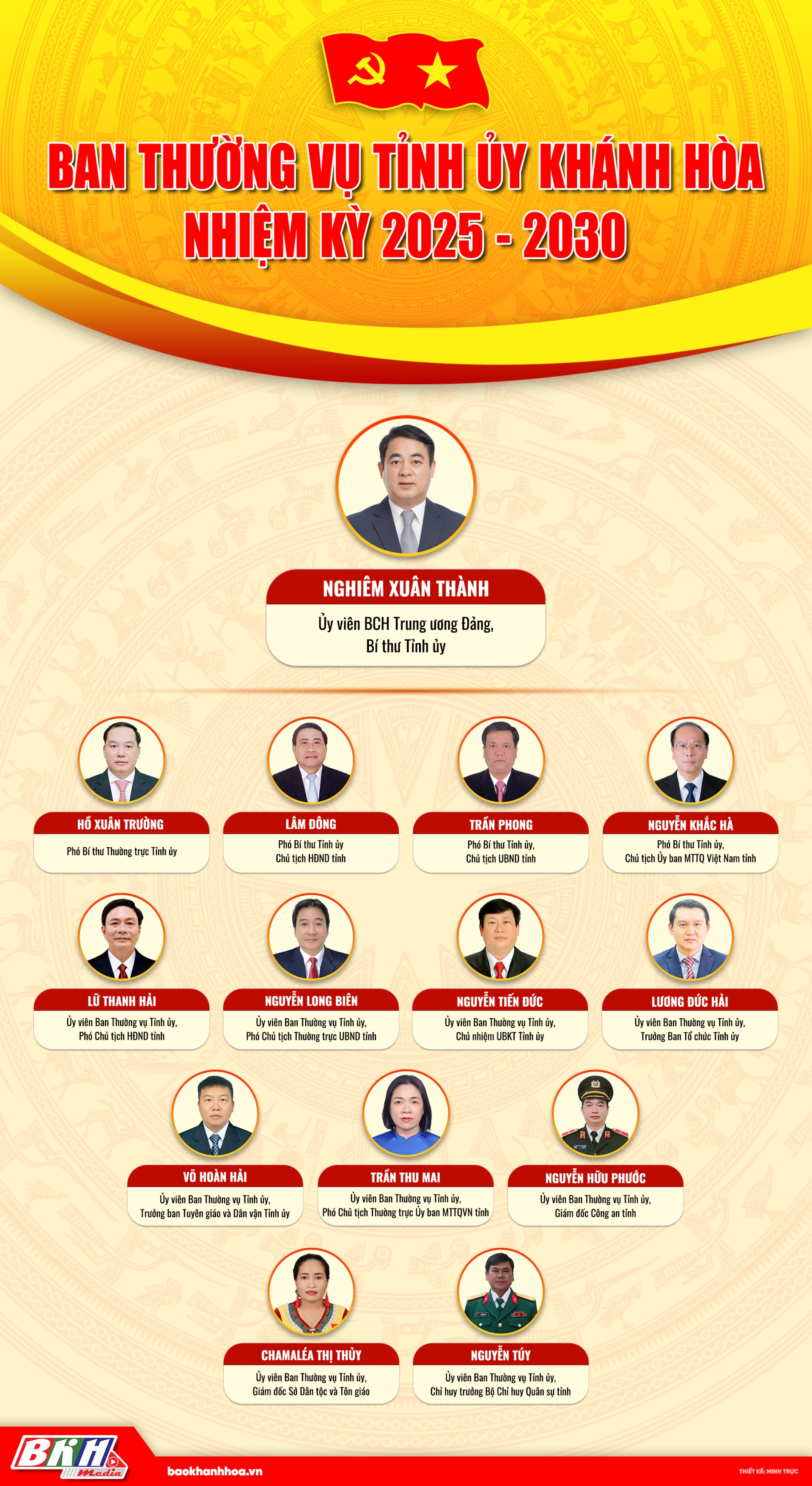 Báo và Phát thanh, Truyền hình Khánh Hòa xin trân trọng giới thiệu danh sách các đồng chí Ủy viên Ban Thường vụ Tỉnh ủy Khánh Hòa, nhiệm kỳ 2025 - 2030.