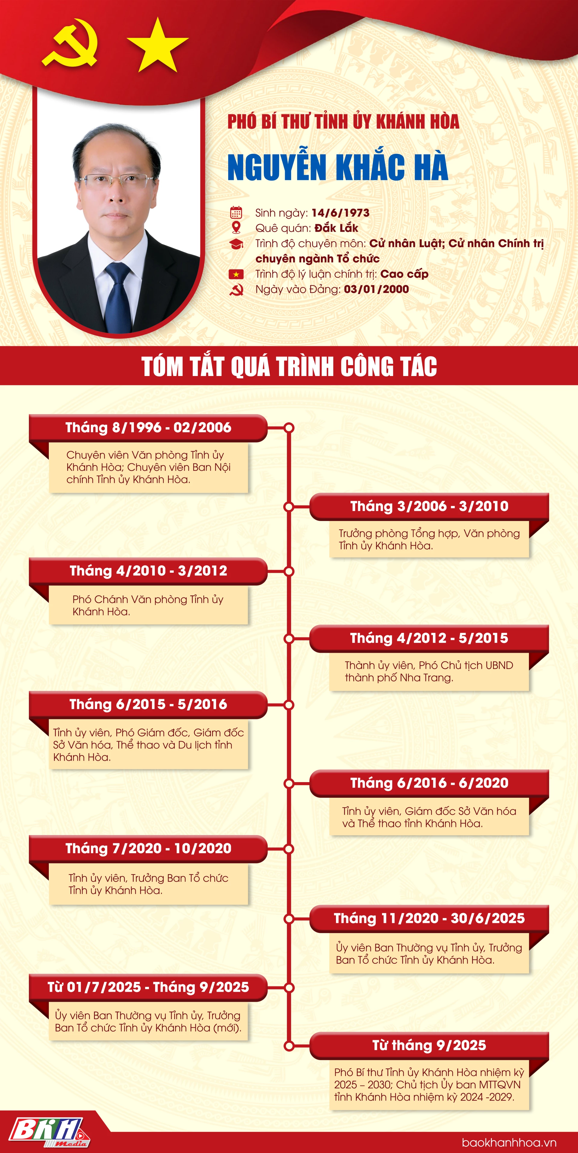 Báo và Phát thanh, Truyền hình Khánh Hòa xin trân trọng giới thiệu tóm tắt quá trình công tác của đồng chí Nguyễn Khắc Hà - Phó Bí thư Tỉnh ủy Khánh Hòa: