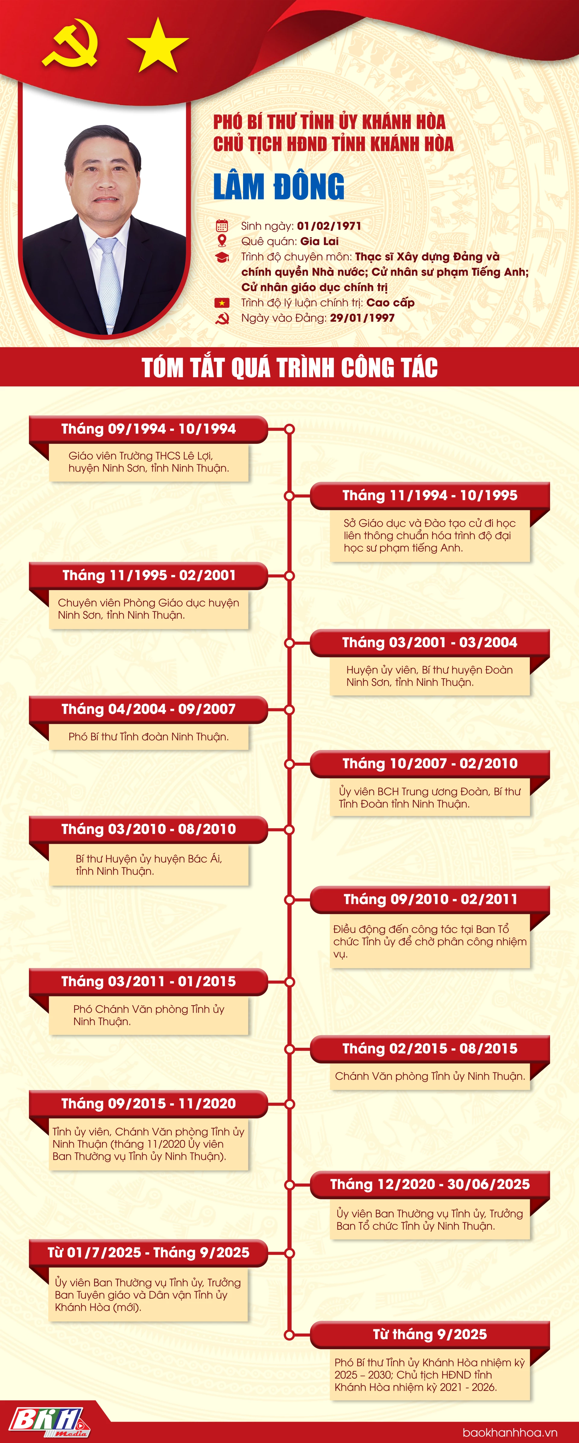 Báo và Phát thanh, Truyền hình Khánh Hòa xin trân trọng giới thiệu tóm tắt quá trình công tác của đồng chí Lâm Đông - Phó Bí thư Tỉnh ủy Khánh Hòa.