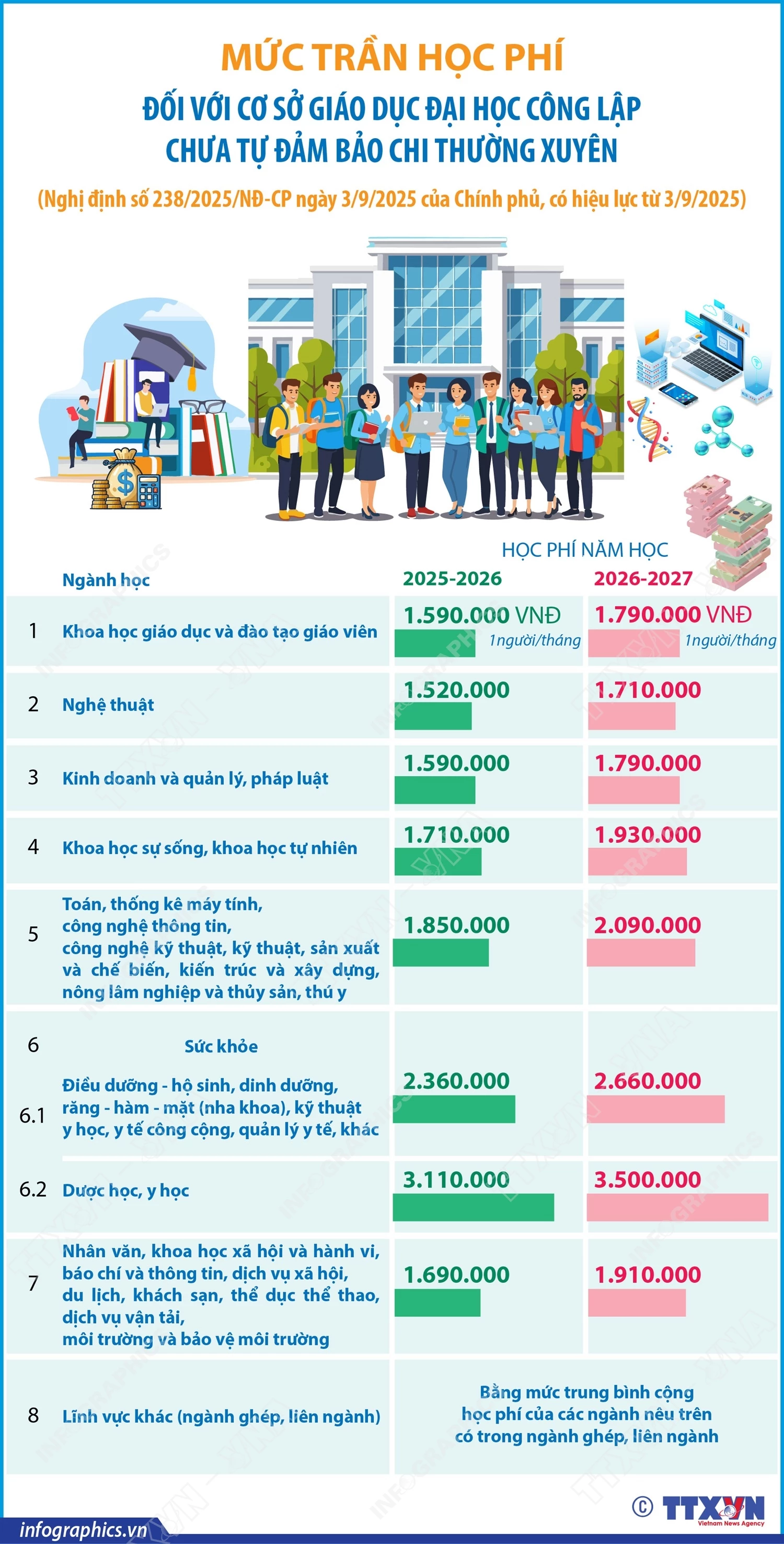 Chính phủ vừa ban hành Nghị định số 238/2025/NĐ-CP quy định về chính sách học phí, miễn, giảm, hỗ trợ học phí, hỗ trợ chi phí học tập và giá dịch vụ trong lĩnh vực giáo dục, đào tạo. Trong đó, Điều 10 của Nghị định quy định cụ thể mức trần học phí đối với cơ sở giáo dục đại học công lập chưa tự đảm bảo chi thường xuyên từ năm học 2025-2026 trở đi.