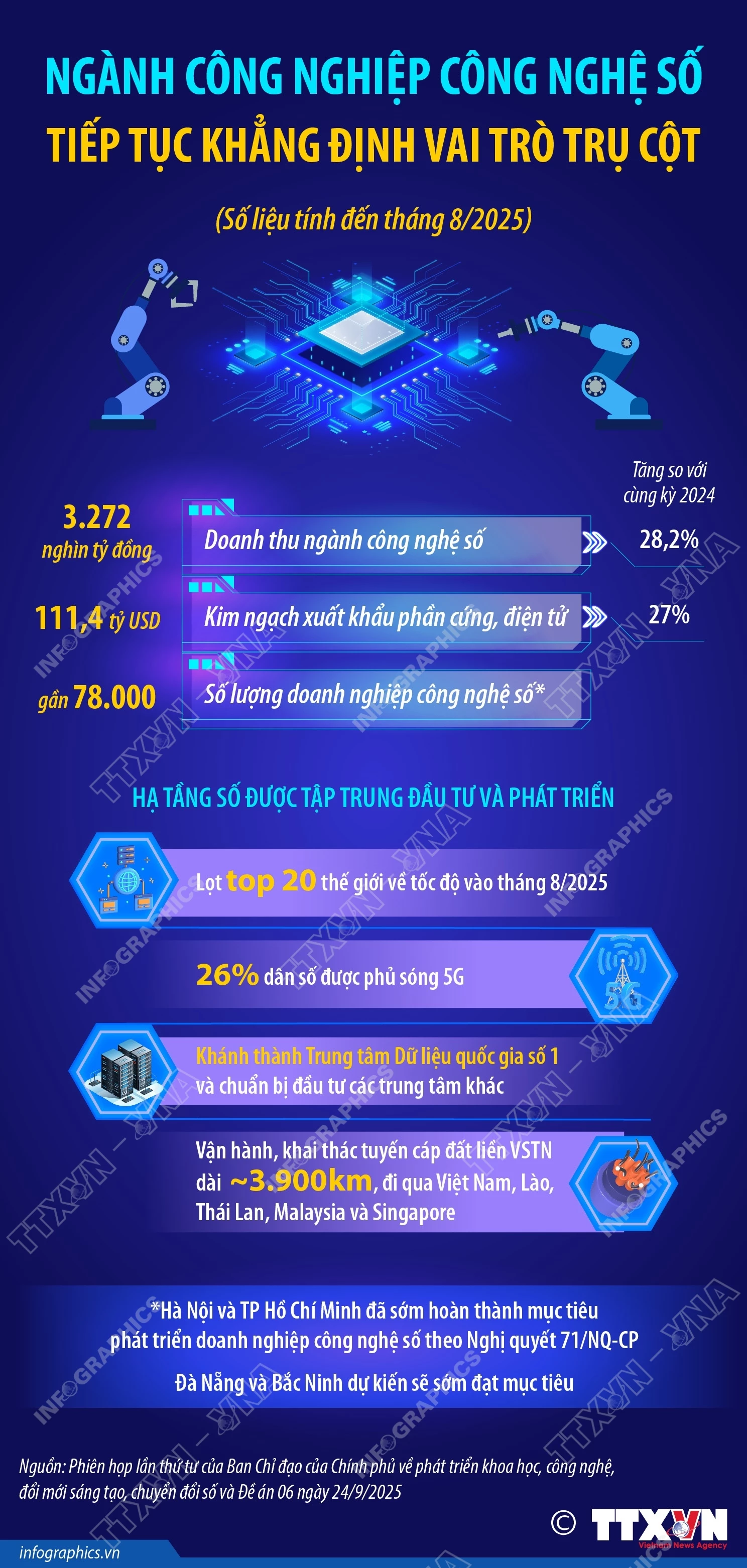 Tại Phiên họp lần thứ tư của Ban Chỉ đạo của Chính phủ về phát triển khoa học, công nghệ, đổi mới sáng tạo, chuyển đổi số và Đề án 06 diễn ra chiều 24/9/2025, Thứ trưởng Thường trực Bộ Khoa học và Công nghệ Vũ Hải Quân đã báo cáo về tình hình thực hiện các nhiệm vụ phát triển khoa học, công nghệ, đổi mới sáng tạo và chuyển đổi số quốc gia. Theo báo cáo, ngành công nghiệp công nghệ số tiếp tục khẳng định vai trò trụ cột, 8 tháng đầu năm 2025 doanh thu đạt hơn 3,2 triệu tỷ đồng, tăng trên 28%, xuất khẩu các sản phẩm số đạt 111,4 tỷ USD, tăng 27%, đóng góp ngày càng lớn vào tăng trưởng kinh tế.