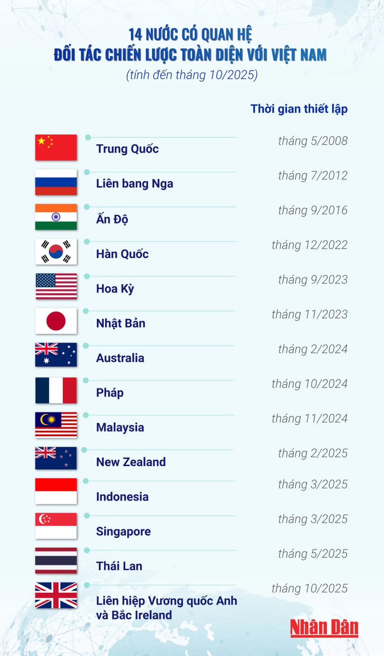Tính đến ngày 29/10/2025, Việt Nam đã thiết lập khuôn khổ Đối tác chiến lược toàn diện với tất cả 5 nước thường trực Hội đồng Bảo an Liên hợp quốc, đưa tổng số Đối tác chiến lược toàn diện của nước ta lên 14 quốc gia.
