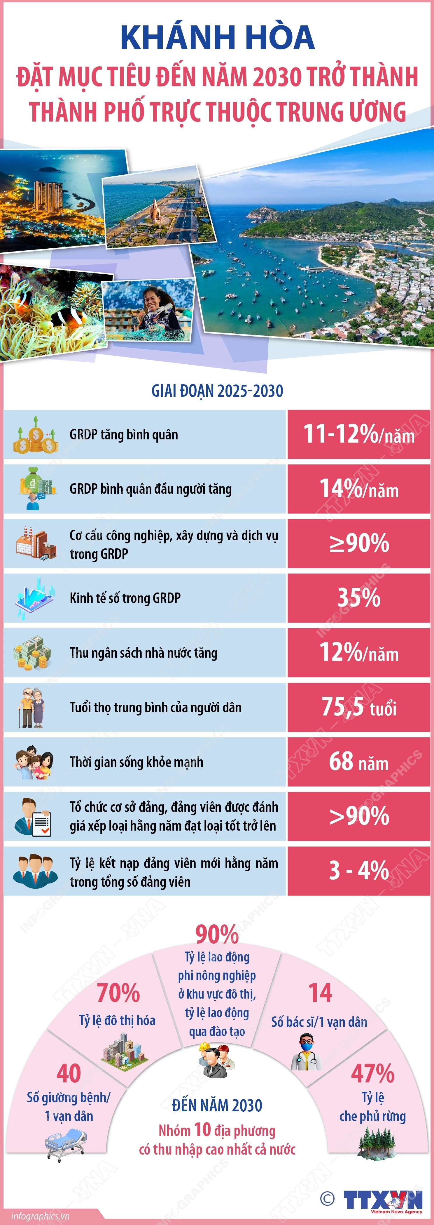 Đại hội đại biểu Đảng bộ tỉnh Khánh Hòa lần thứ I, nhiệm kỳ 2025-2030 đã thông qua Nghị quyết, xác định mục tiêu đưa Khánh Hòa vững bước tiến vào thập niên nâng tầm phát triển, đến năm 2030, trở thành thành phố trực thuộc Trung ương; là trung tâm dịch vụ, du lịch cảng biển quốc tế, trung tâm dữ liệu quốc gia và khu vực, cực tăng trưởng cao của cả nước… Nghị quyết đề ra 9 chỉ tiêu kinh tế, trong đó đáng chú ý: GRDP tăng bình quân 11-12%/năm, GRDP bình quân đầu người tăng 14%/năm, đến năm 2030 nằm trong nhóm 10 địa phương có thu nhập cao nhất cả nước. Cơ cấu công nghiệp, xây dựng và dịch vụ chiếm từ 90% GRDP; kinh tế số đóng góp 35%. Thu ngân sách nhà nước tăng 12%/năm, đứng nhóm 10 tỉnh, thành có doanh thu nội địa cao nhất. Tỷ lệ đô thị hóa đạt 70% vào năm 2030…
