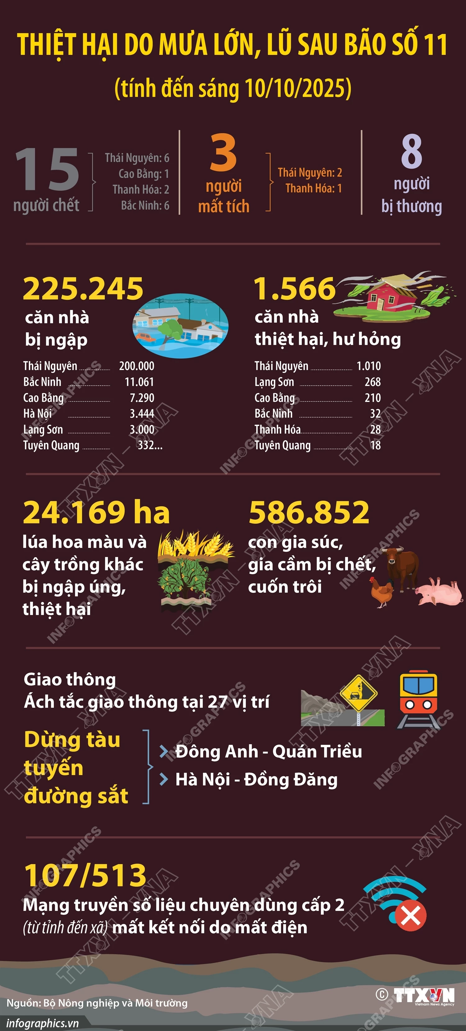 Theo báo cáo nhanh của các tỉnh, thành phố: Sơn La, Tuyên Quang, Lạng Sơn, Cao Bằng, Thái Nguyên, Hà Nội, Bắc Ninh, Thanh Hóa, tính đến sáng 10/10/2025, mưa lớn, lũ sau bão số 11 đã làm 18 người chết và mất tích; 8 người bị thương; 225.245 căn nhà bị ngập (Thái Nguyên 200.000 nhà; Bắc Ninh 11.061 nhà; Cao Bằng 7.290 nhà; Lạng Sơn 3.000 nhà, Hà Nội 3.444 nhà; Tuyên Quang 332 nhà...); 1.566 căn nhà bị thiệt hại, hư hỏng (Tuyên Quang 18 nhà, Lạng Sơn 268 nhà, Cao Bằng 210 nhà, Thái Nguyên 1.010 nhà, Bắc Ninh 32 nhà, Thanh Hóa 28 nhà); 24.169 ha lúa, hoa màu và cây trồng khác bị ngập úng, thiệt hại; 586.852 con gia súc, gia cầm bị chết, cuốn trôi… Hiện các địa phương vẫn đang tiếp tục rà soát và tổng hợp tình hình thiệt hại.