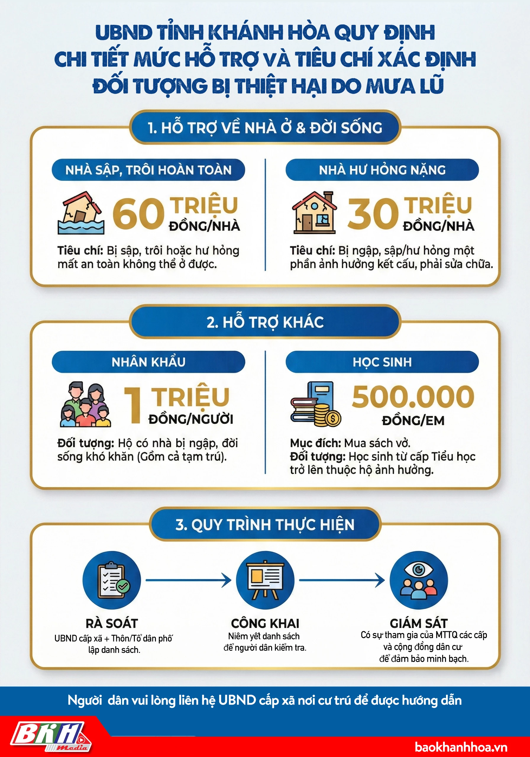 [Infographic] UBND tỉnh Khánh Hòa quy định chi tiết mức hỗ trợ và tiêu chí xác định đối tượng bị thiệt hại do mưa lũ