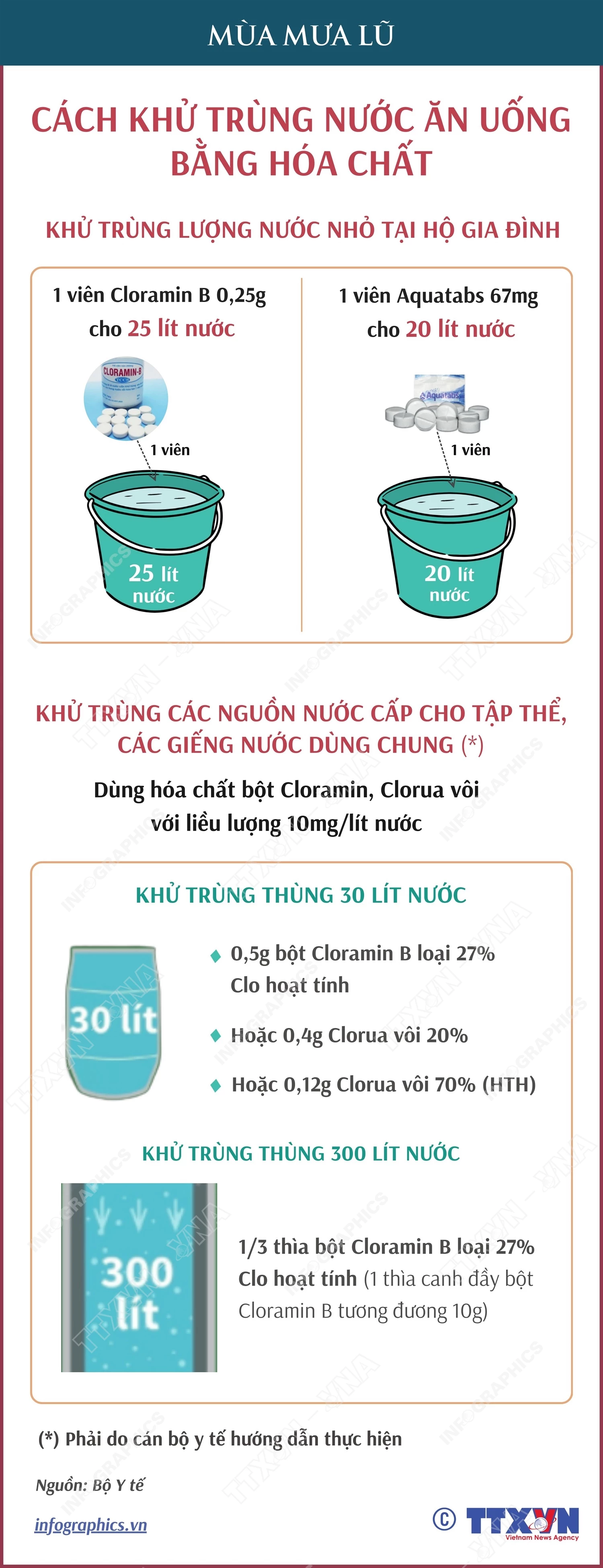 [Infographic] Xử lý nước ăn uống trong mùa mưa lũ: Khử trùng nước bằng hóa chất