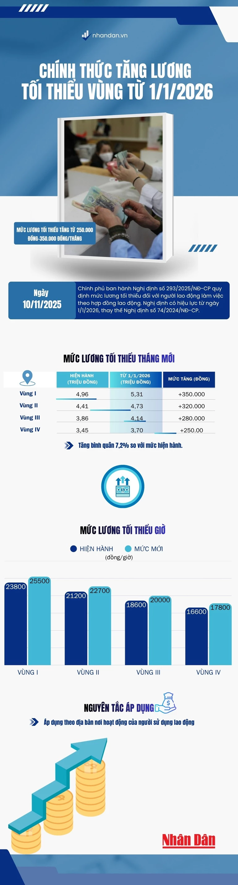 Ngày 10/11/2025, Chính phủ ban hành Nghị định số 293/2025/NĐ-CP quy định mức lương tối thiểu đối với người lao động làm việc theo hợp đồng lao động. Nghị định có hiệu lực từ ngày 1/1/2026, thay thế Nghị định số 74/2024/NĐ-CP.