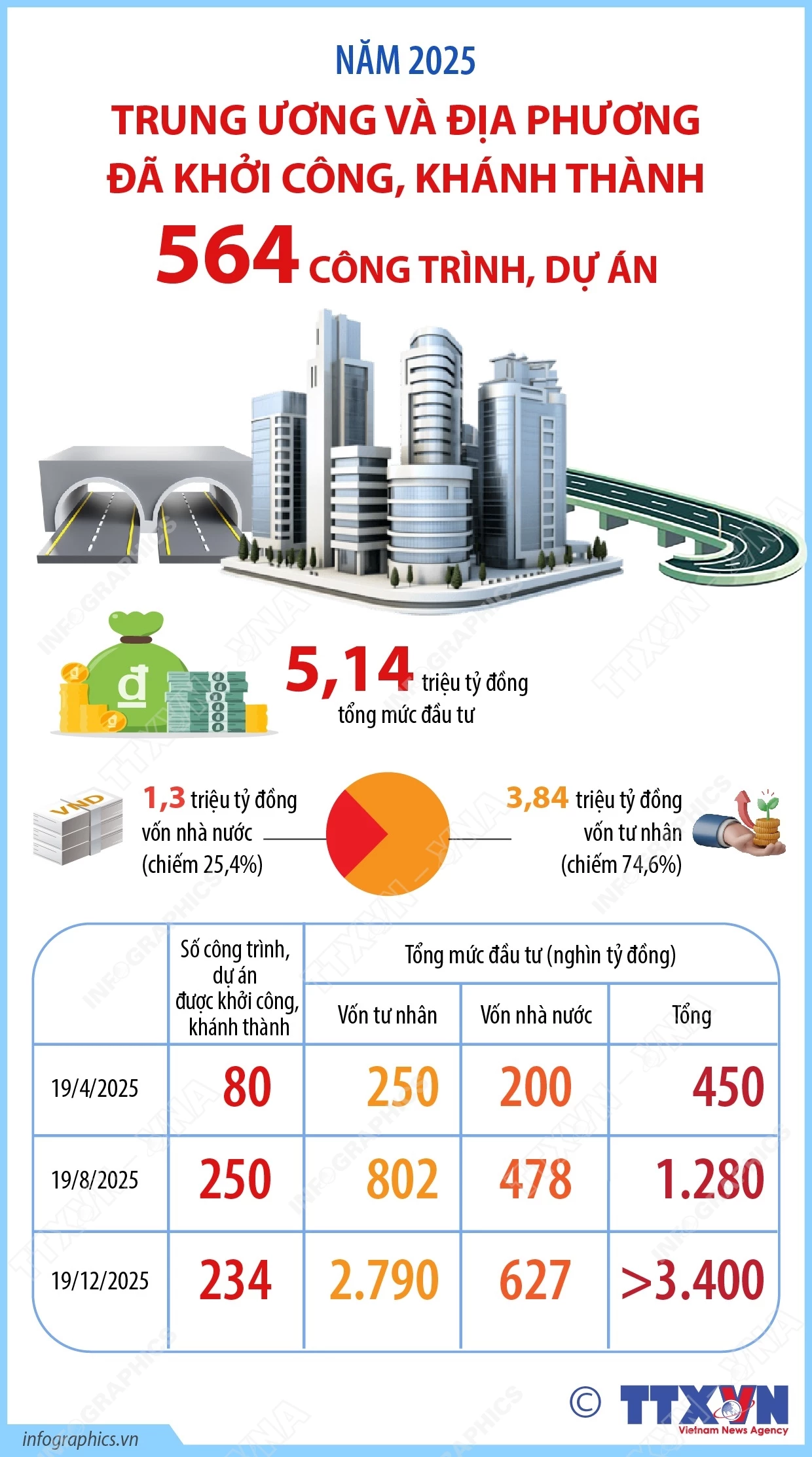 Năm 2025, Trung ương và địa phương đã khởi công, khánh thành 564 công trình, dự án với tổng mức đầu tư trên 5,14 triệu tỷ đồng, nguồn vốn tư nhân 3,84 triệu tỷ chiếm 74,6%, nguồn vốn nhà nước 1,3 triệu tỷ, chiếm 25,4%, trong đó: Dịp 19/4/2025 khởi công, khánh thành 80 công trình, dự án với tổng mức đầu tư khoảng 450 nghìn tỷ đồng; Dịp 19/8/2025 khởi công, khánh thành 250 công trình, dự án với tổng mức đầu tư khoảng 1,28 triệu tỷ đồng; Ngày 19/12/2025, khởi công, khánh thành, thông xe kỹ thuật 234 dự án, công trình với tổng mức đầu tư hơn 3,4 triệu tỷ đồng.