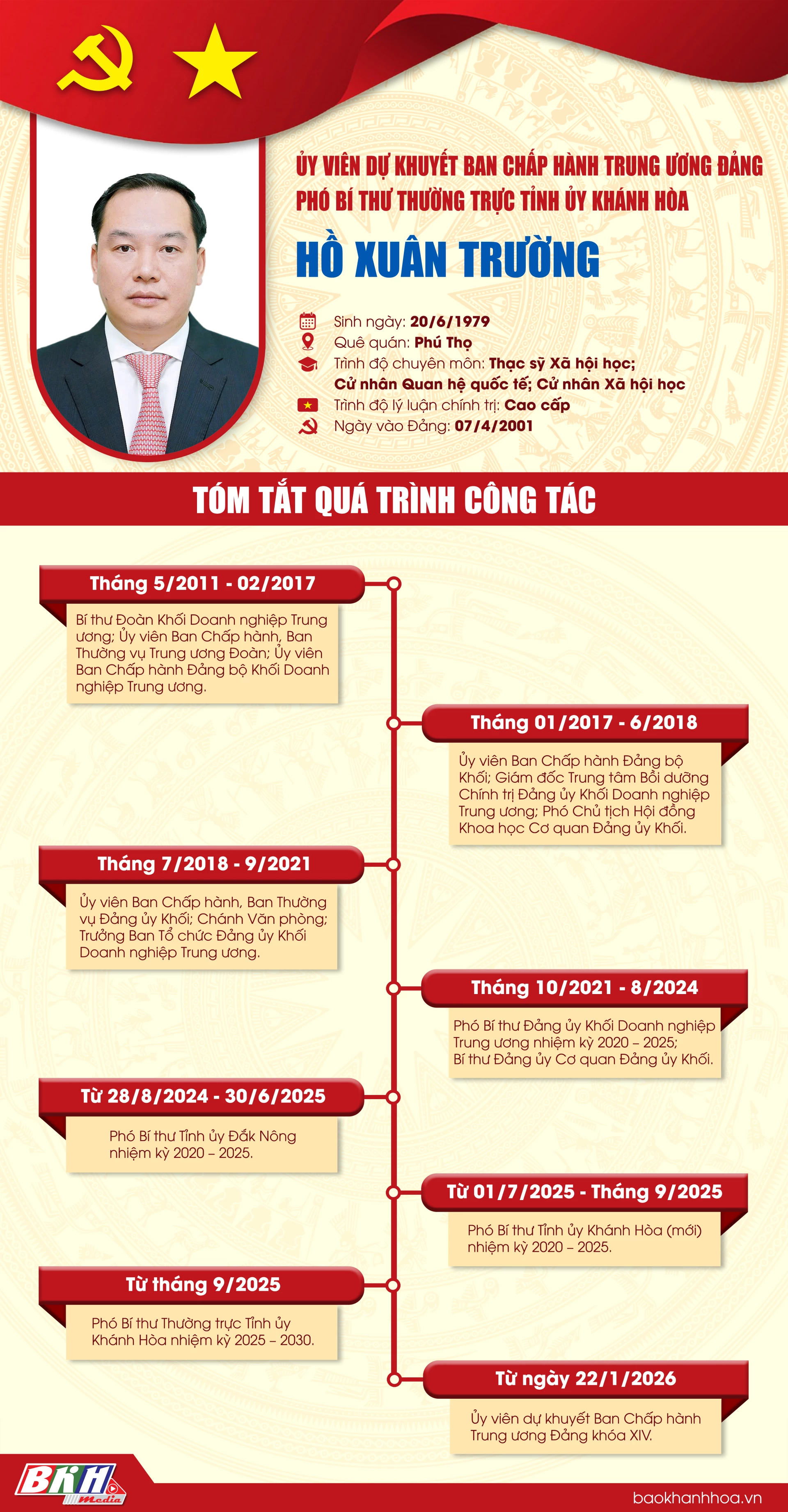 Báo và Phát thanh, Truyền hình Khánh Hòa xin trân trọng giới thiệu tóm tắt quá trình công tác của đồng chí Hồ Xuân Trường - Ủy viên dự khuyết Ban Chấp hành Trung ương Đảng khóa XIV, Phó Bí thư Thường trực Tỉnh ủy Khánh Hòa.