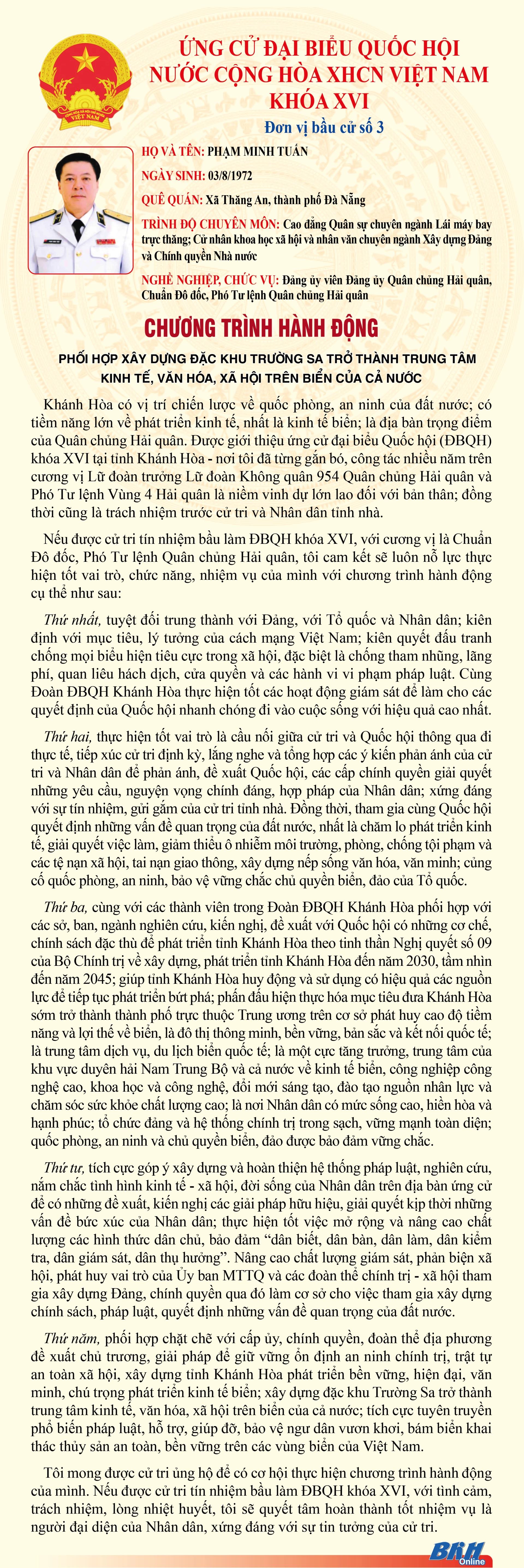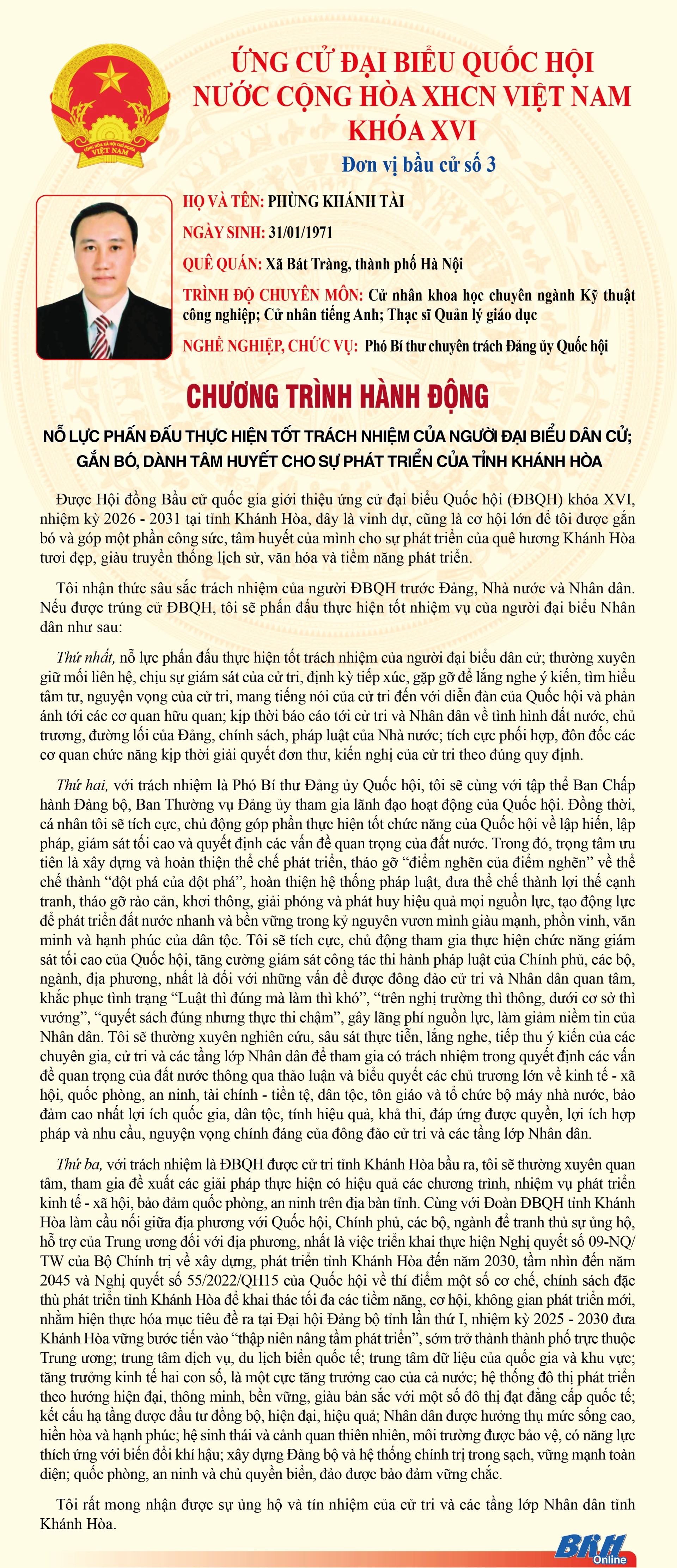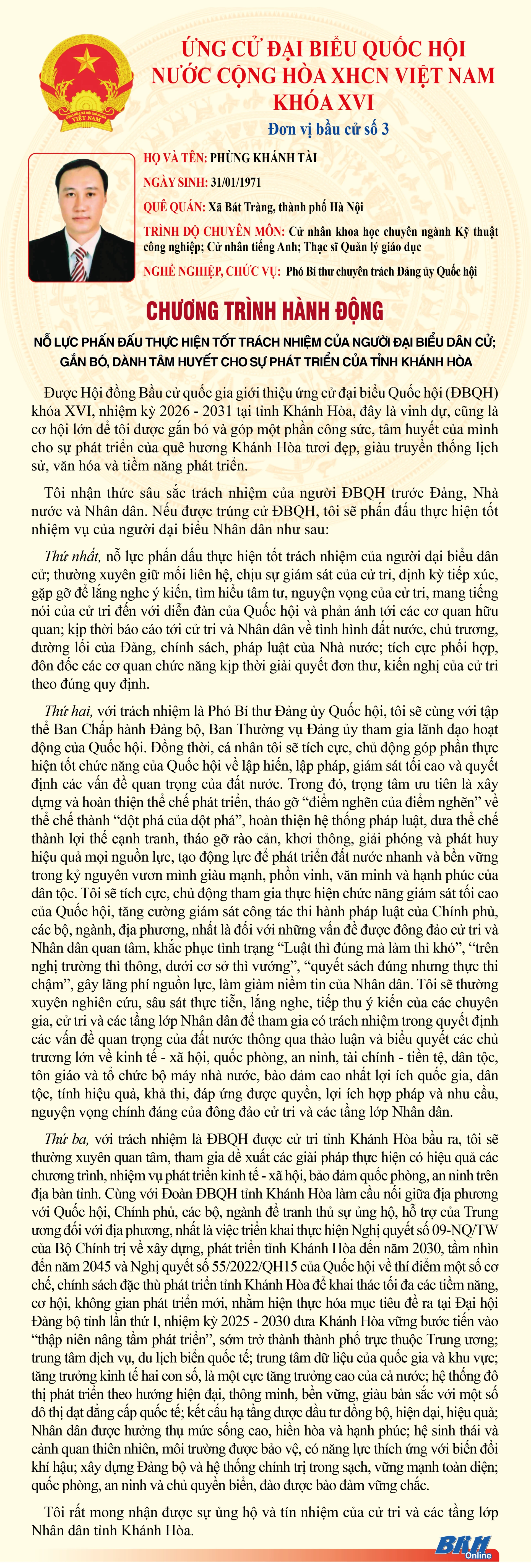 Báo và Phát thanh, Truyền hình Khánh Hòa trân trọng giới thiệu đến cử tri trong tỉnh chương trình hành động của những người ứng cử đại biểu Quốc hội khóa XVI tại Khánh Hòa tại Đơn vị bầu cử số 3 (Gồm 11 xã: Cam Hiệp, Cam An, Suối Dầu, Cam Lâm, Nam Cam Ranh, Thuận Bắc, Công Hải, Vĩnh Hải, Ninh Hải, Xuân Hải, Mỹ Sơn; 6 phường: Bắc Cam Ranh, Cam Linh, Cam Ranh, Ba Ngòi, Ninh Chử, Bảo An; và đặc khu Trường Sa).