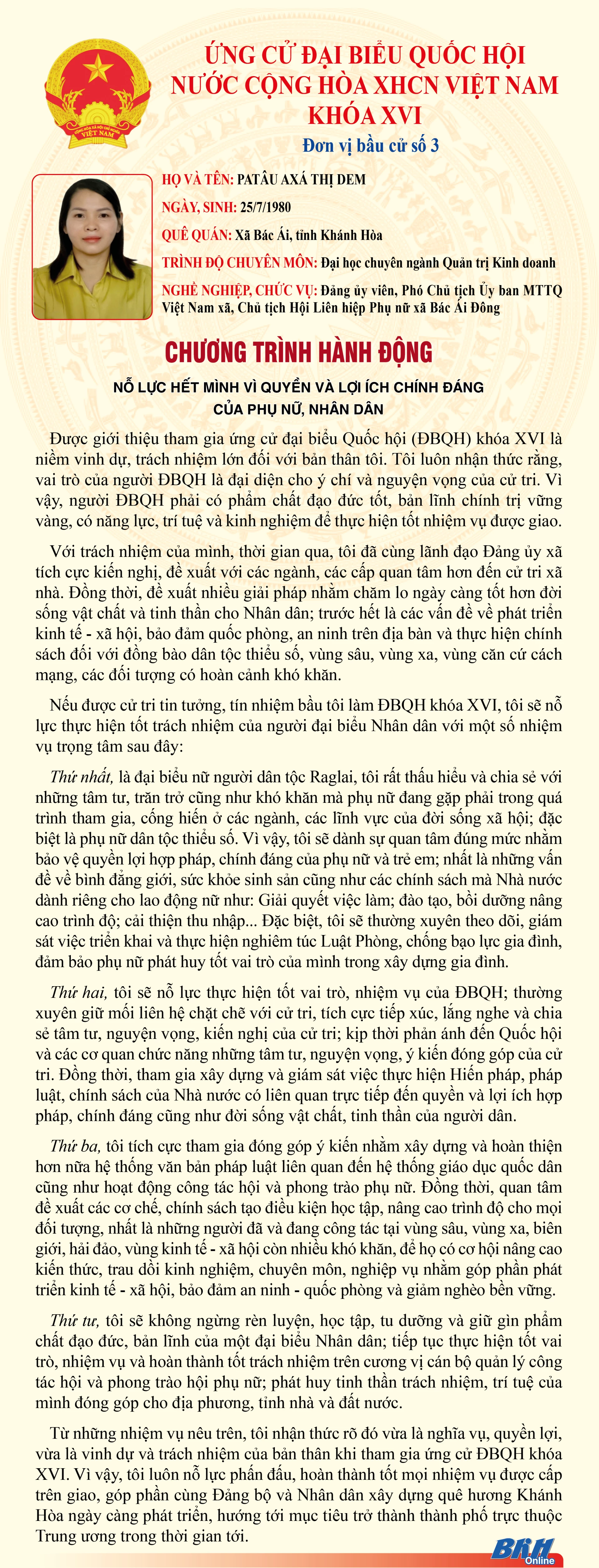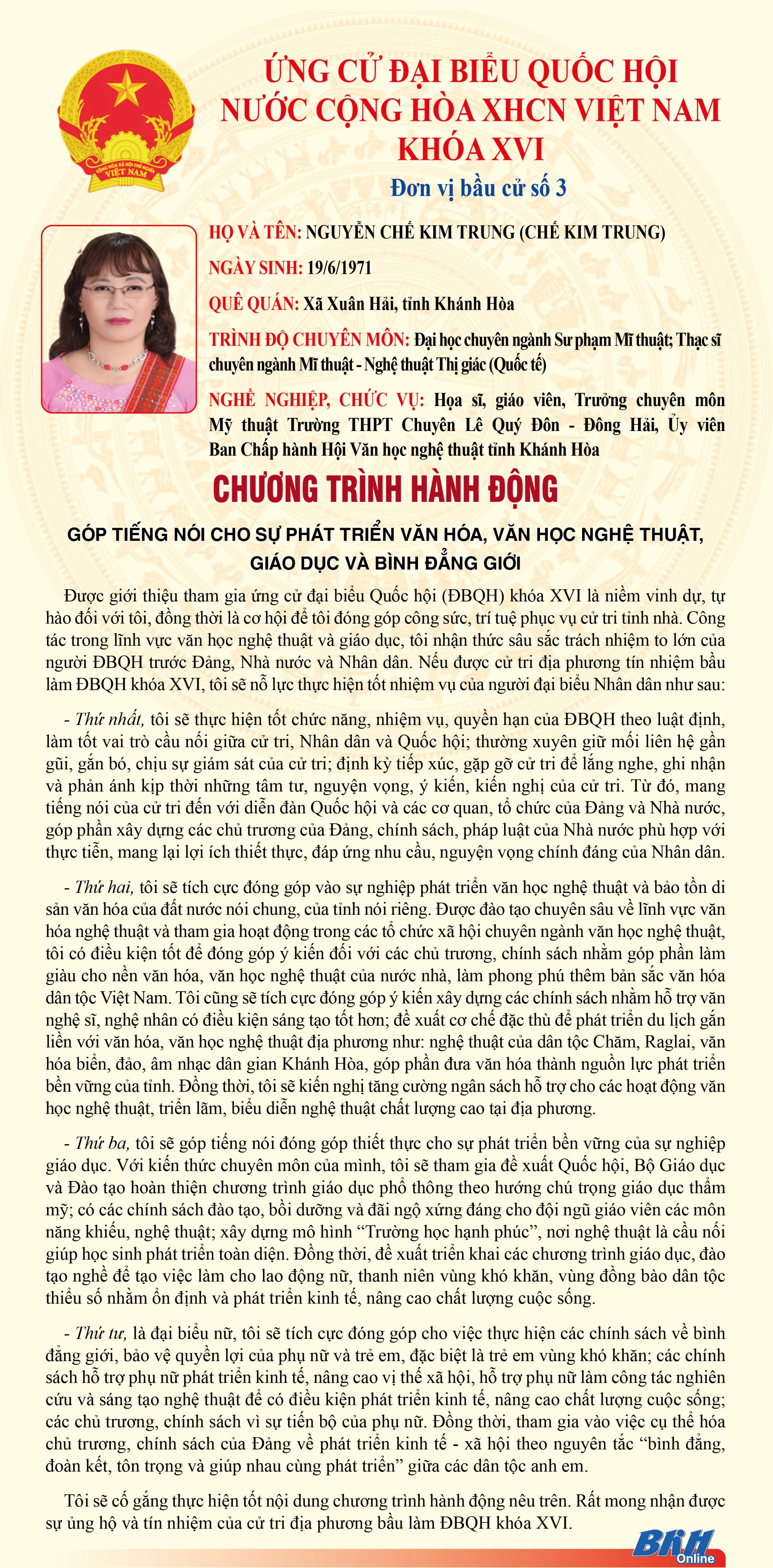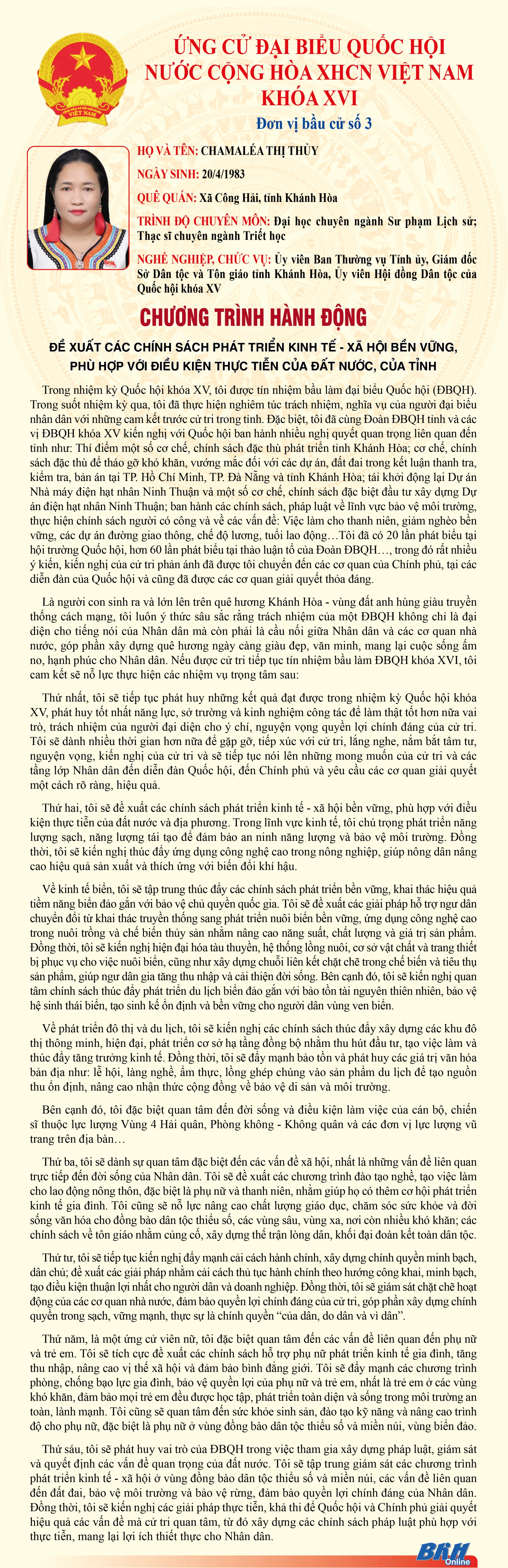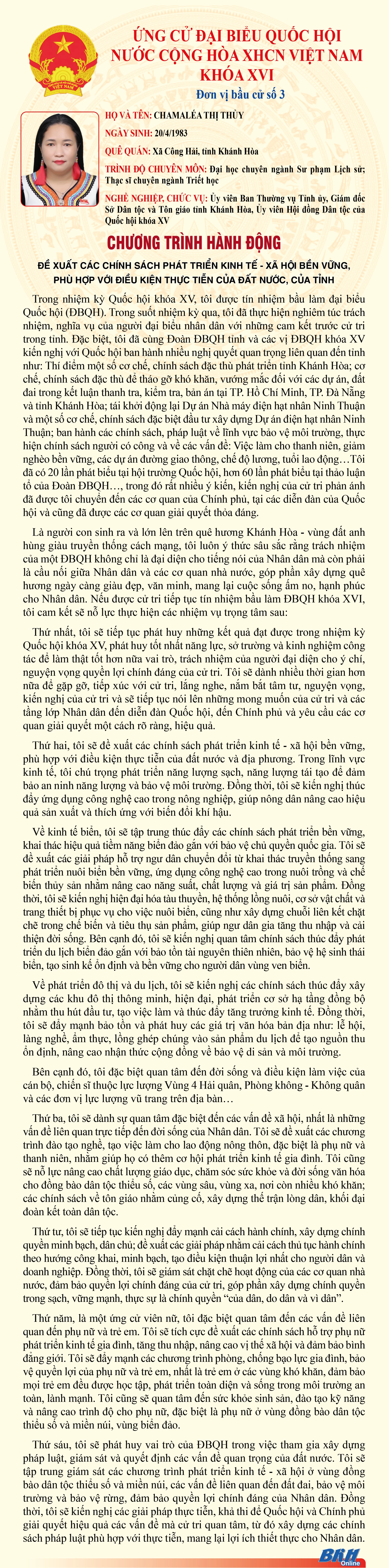 Báo và Phát thanh, Truyền hình Khánh Hòa trân trọng giới thiệu đến cử tri trong tỉnh chương trình hành động của những người ứng cử đại biểu Quốc hội khóa XVI tại Khánh Hòa tại Đơn vị bầu cử số 3 (Gồm 11 xã: Cam Hiệp, Cam An, Suối Dầu, Cam Lâm, Nam Cam Ranh, Thuận Bắc, Công Hải, Vĩnh Hải, Ninh Hải, Xuân Hải, Mỹ Sơn; 6 phường: Bắc Cam Ranh, Cam Linh, Cam Ranh, Ba Ngòi, Ninh Chử, Bảo An; và đặc khu Trường Sa).