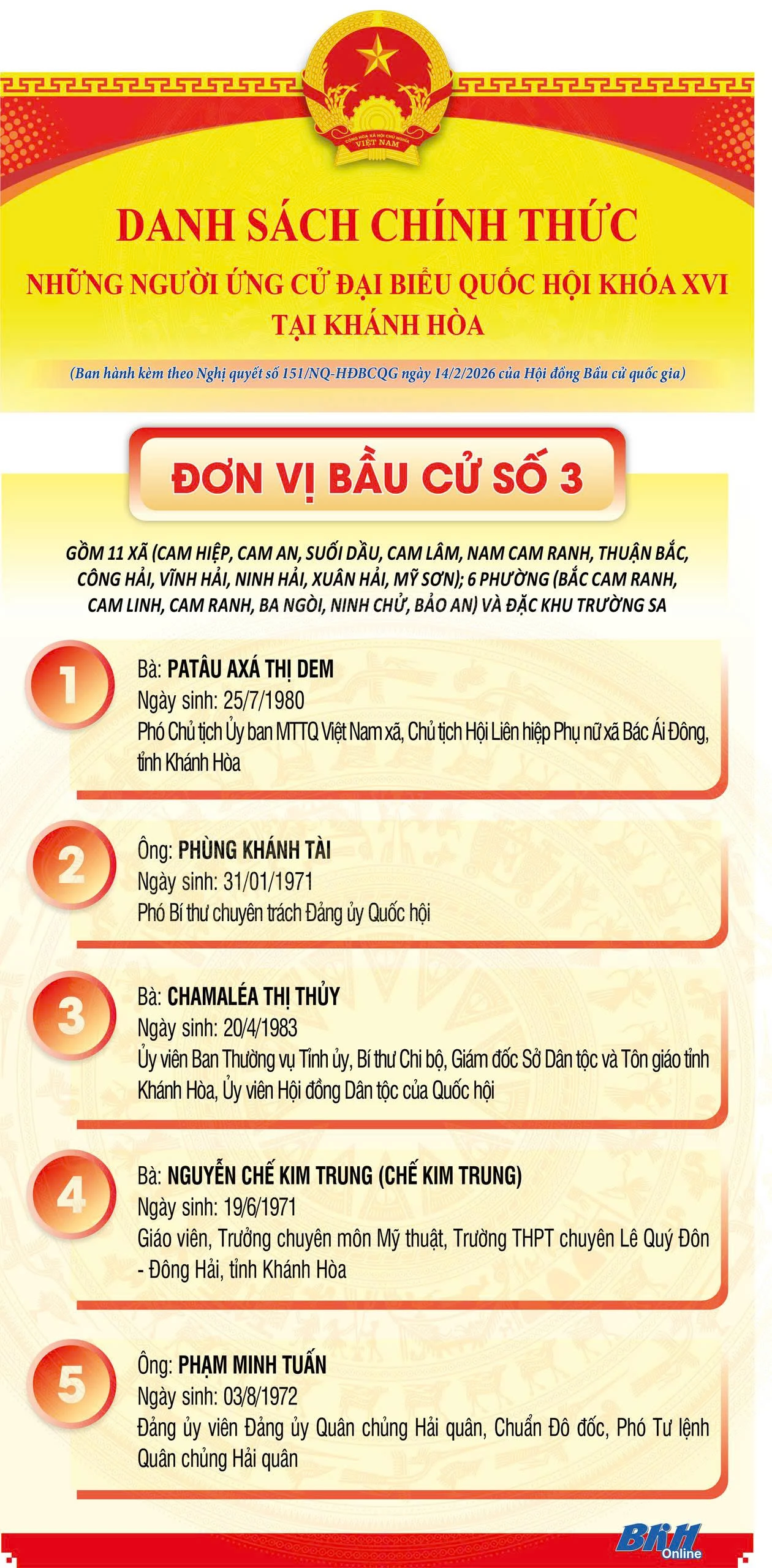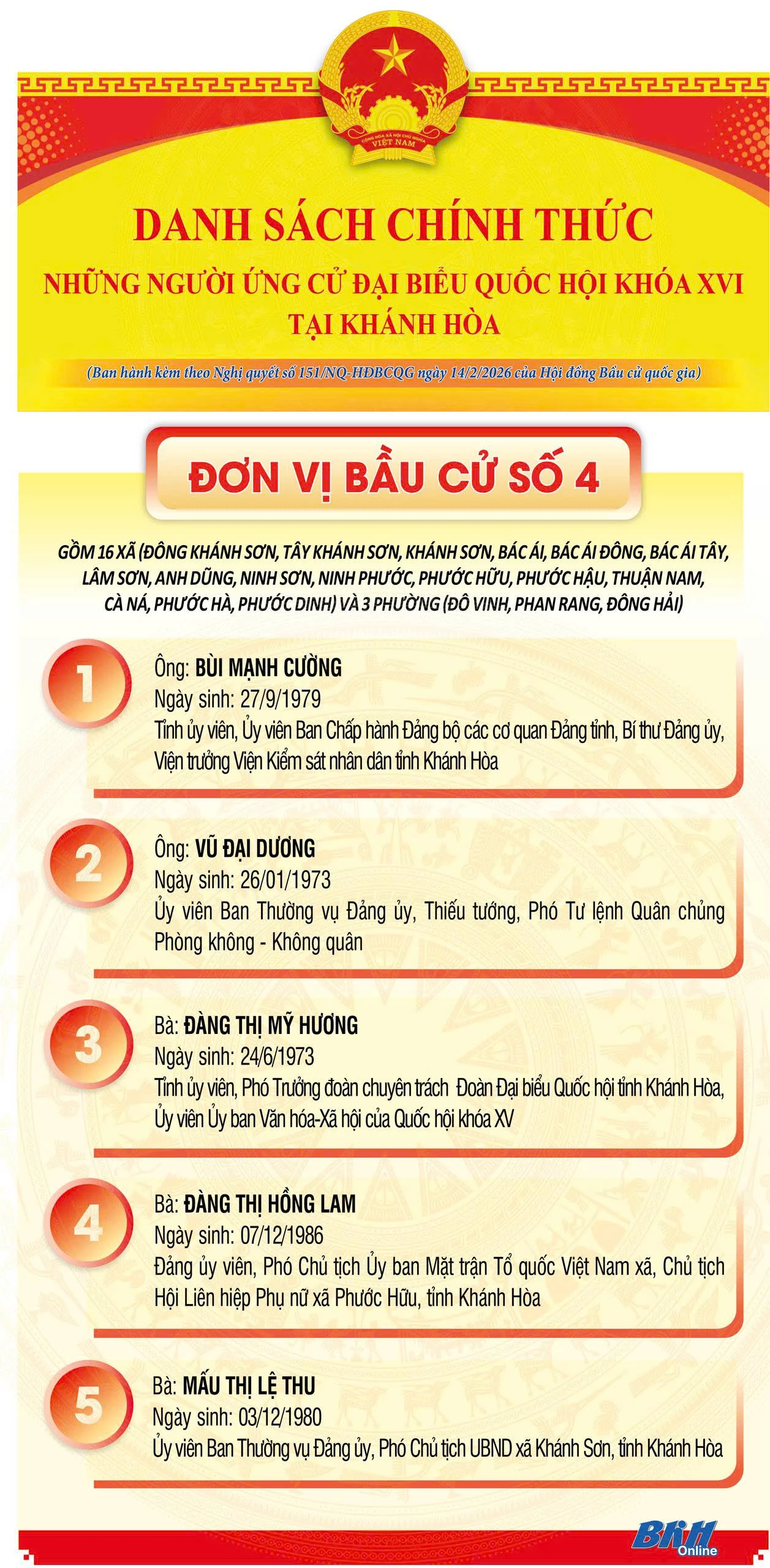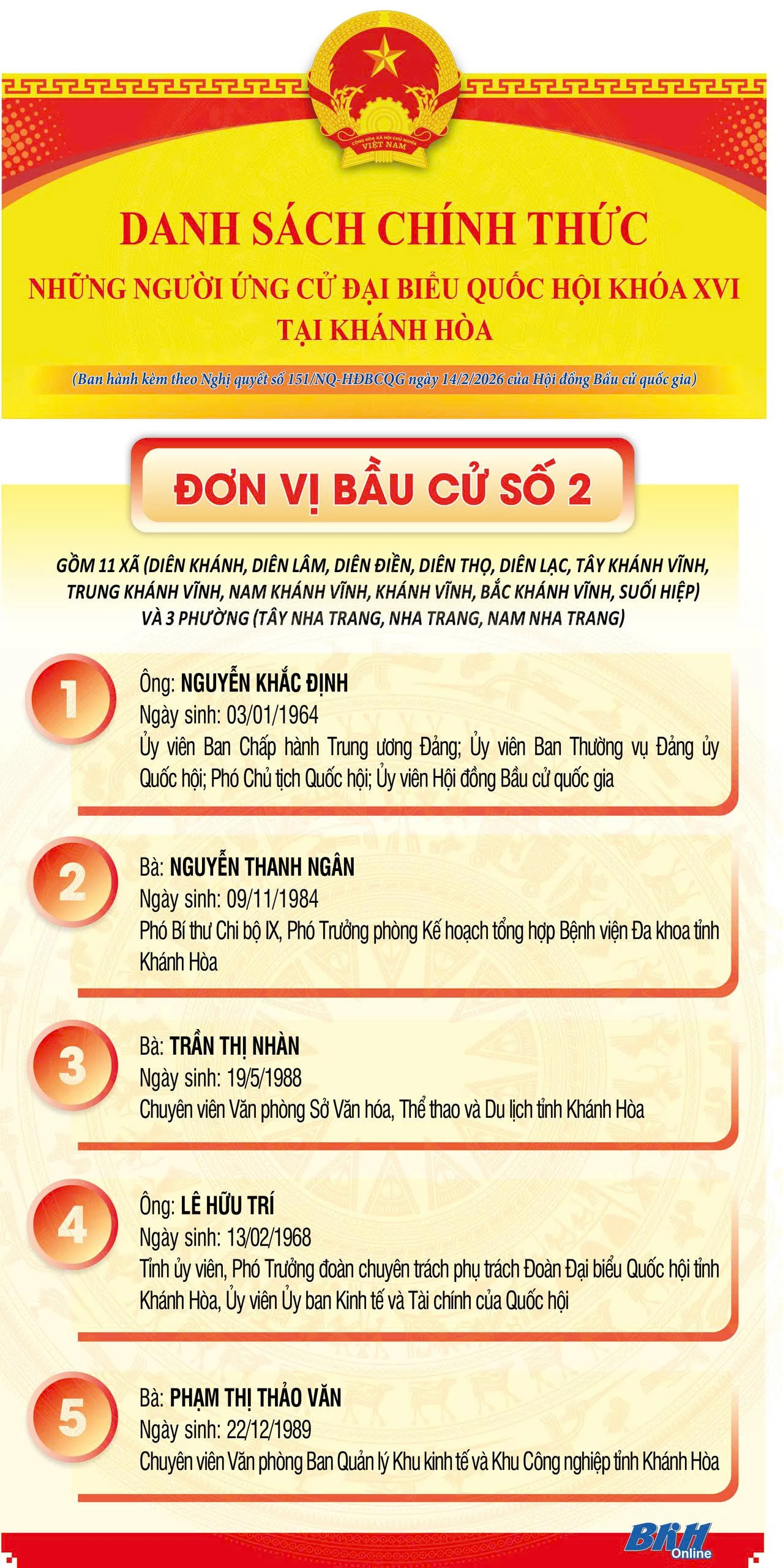 Theo Nghị quyết số 151/NQ-HĐBCQG, ngày 14/2/2026 công bố danh sách chính thức những người ứng cử đại biểu Quốc hội khóa XVI theo từng đơn vị bầu cử trong cả nước, tỉnh Khánh Hòa có 4 đơn vị bầu cử đại biểu Quốc hội; có 20 người ứng cử để bầu 12 đại biểu Quốc hội.